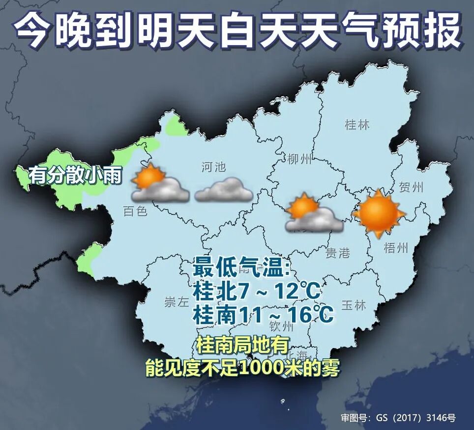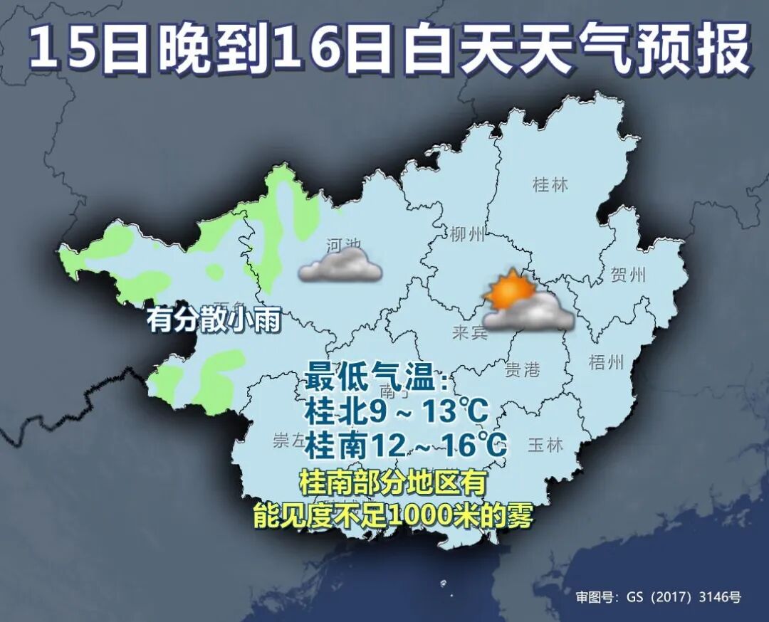 白天大部最高气温 也保持在20~26℃的范围 天气将变得又暖又湿润 体感就不会这么干爽了 大家晒被子、晒腊肠要抓紧了 雨雾天气将上线 能见度变差 对交通出行不利 驾车要注意安全 减速慢行,保持足够的制动距离 未来三天天气预报 广西气象台14日17时发布预报: 陆地天气预报 今天晚上到明天白天,百色、河池两市多云到阴天有分散小雨,其它地区多云到晴。桂南局地有能见度不足1000米的雾。最低气温:桂北7~12℃,桂南11~16℃。 森林火险气象等级:全区4级,高火险。 南宁市:今天晚上到明天白天,多云,东南风1~2级,最低气温13℃,最高气温25℃。 15日晚上到16日白天,桂西北阴天有分散小雨,其它地区多云。桂南部分地区有能见度不足1000米的雾。最低气温:桂北9~13℃,桂南12~16℃。 16日晚上到17日白天,桂西、桂北阴天有小雨、局地中到大雨,其它地区多云间阴。桂南部分地区有能见度不足1000米的雾。最低气温:桂北10~16℃,桂南14~18℃。 海洋天气预报 北部湾海面:今天晚上到明天白天,晴到多云,偏东风4~5级;15日晚上到16日白天,多云,有雾,偏东风4~5级;16日晚上到17日白天,多云到阴天有分散小雨,有雾,偏东风4~5级。