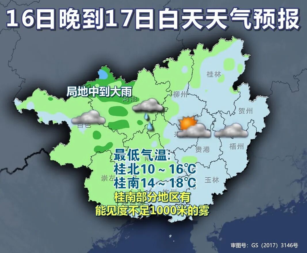 16日晚上至17日白天 阴雨的地盘扩张到桂西、桂北 局地还有中到大雨 其他地区阳光也将限量供应