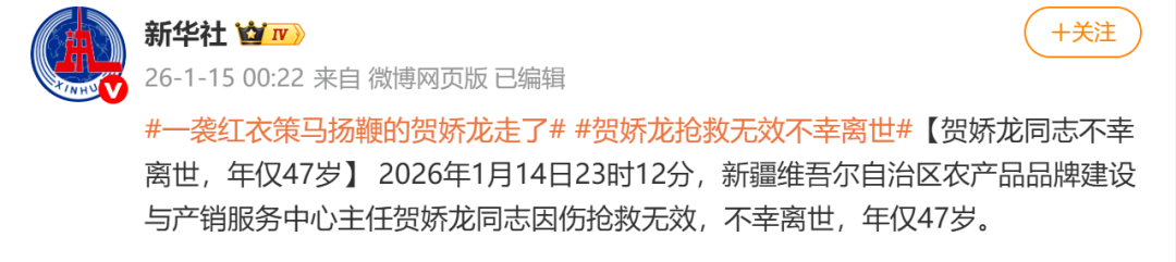 贺娇龙最近一次发布的朋友圈。 短短数语 道尽她对热爱的事业无悔坚守 谁能想到 这句充满力量的话语 竟成她留给世界的最后箴言 ...... 据新华社消息,2026年1月14日23时12分,新疆维吾尔自治区农产品品牌建设与产销服务中心主任贺娇龙同志因伤抢救无效,不幸离世,年仅47岁。 1月11日15时许,因工作需要,贺娇龙在博乐市进行农产品电商销售活动前期拍摄时,意外坠马致头部严重受伤,随即被送往博州人民医院救治。博州党委、政府迅速安排,组织当地医疗资源全力抢救,并积极联系国内相关学科专家进行会诊,自治区卫健委选派专家赶赴当地参加抢救。1月13日,贺娇龙转入新疆医科大学第一附属医院接受重症医学救治,1月14日,因伤势过重,抢救无效,不幸离世。