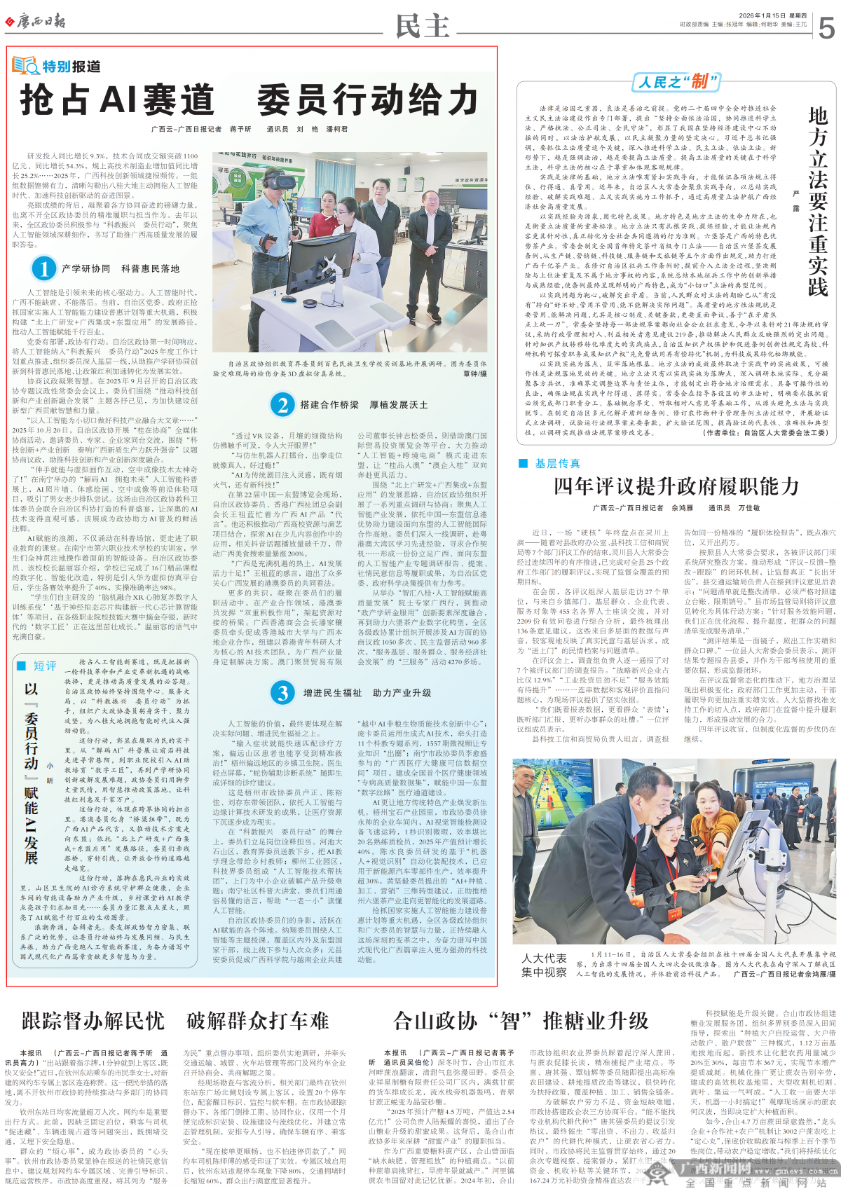 自治区政协组织教育界委员到百色民族卫生学校实训基地开展调研。图为委员体验灾难现场的检伤分类3D虚拟仿真系统。覃钟 摄 产学研协同 科普惠民落地 人工智能是引领未来的核心驱动力。人工智能时代,广西不能缺席、不能落后。当前,自治区党委、政府正抢抓国家实施人工智能能力建设普惠计划等重大机遇,积极构建“北上广研发+广西集成+东盟应用”的发展路径,推动人工智能赋能千行百业。 党委有部署,政协有行动。自治区政协第一时间响应,将人工智能纳入“科教振兴 委员行动”2025年度工作计划重点推进,组织委员深入基层一线,从助推产学研协同创新到科普惠民落地,让政策红利加速转化为发展实效。 协商议政凝聚智慧。在2025年9月召开的自治区政协专题议政性常委会会议上,委员们围绕“推动科技创新和产业创新融合发展”主题各抒己见,为加快建设创新型广西贡献智慧和力量。 “以人工智能为小切口做好科技产业融合大文章……”2025年10月20日,自治区政协开展“桂在协商”全媒体协商活动,邀请委员、专家、企业家同台交流,围绕“科技创新+产业创新 奏响广西新质生产力跃升强音”议题协商议政,助推科技创新和产业创新深度融合。 “伸手就能与虚拟画作互动,空中成像技术太神奇了!”在南宁举办的“解码AI 拥抱未来”人工智能科普展上,AI照片墙、体感绘画、空中成像等前沿体验项目,吸引了男女老少排队尝试。这场由自治区政协教科卫体委员会联合自治区科协打造的科普盛宴,让深奥的AI技术变得直观可感。该展成为政协助力AI普及的鲜活注脚。 AI赋能的浪潮,不仅涌动在科普场馆,更走进了职业教育的课堂。在南宁市第六职业技术学校的实训室,学生们全神贯注地操作着面前的智能设备。自治区政协委员、该校校长温丽容介绍,学校已完成了16门精品课程的数字化、智能化改造,特别是引入华为虚拟仿真平台后,学生备赛效率提升了40%,实操准确率达98%。 “学生们自主研发的‘脑机融合XR心肺复苏数字人训练系统’‘基于神经拟态芯片构建新一代心芯计算智能体’等项目,在各级职业院校技能大赛中摘金夺银,新时代的‘数字工匠’正在这里茁壮成长。”温丽容的语气中充满自豪。 搭建合作桥梁 厚植发展沃土 “透过VR设备,月壤的细微结构仿佛触手可及,令人大开眼界!” “与仿生机器人打擂台,出拳走位就像真人,好过瘾!” “AI为传统剧目注入灵感,既有烟火气,还有新科技!” 在第22届中国—东盟博览会现场,自治区政协委员、香港广西社团总会副会长王祖蓝忙着为广西AI产品“代言”。他还积极推动广西高校资源与演艺项目结合,探索AI在少儿内容创作中的应用,相关抖音话题播放量破千万,带动广西美食搜索量暴涨200%。 “广西是充满机遇的热土,AI发展活力十足!”王祖蓝的感言,道出了众多关心广西发展的港澳委员的共同看法。 更多的共识,凝聚在委员们的履职活动中。在产业合作领域,港澳委员发挥“双重积极作用”,架起资源对接的桥梁。广西香港商会会长潘家穰委员牵头促成香港城市大学与广西本地企业合作,组建以香港青年科研人才为核心的AI技术团队,为广西产业量身定制解决方案。澳门聚贤贸易有限公司董事长钟志松委员,则借助澳门国际贸易投资展览会等平台,大力推动“人工智能+跨境电商”模式走进东盟,让“桂品入澳”“澳企入桂”双向奔赴更具活力。 围绕“北上广研发+广西集成+东盟应用”的发展思路,自治区政协组织开展了一系列重点调研与协商:聚焦人工智能产业发展,依托中国—东盟信息港优势助力建设面向东盟的人工智能国际合作高地。委员们深入一线调研,赴粤港澳大湾区学习先进经验,寻求合作契机……形成一份份立足广西、面向东盟的人工智能产业专题调研报告、提案、社情民意信息等履职成果,为自治区党委、政府科学决策提供有力参考。 从举办“智汇八桂·人工智能赋能高质量发展”院士专家广西行,到推动“政产学研金服用”创新要素深度融合,再到助力六堡茶产业数字化转型,全区各级政协累计组织开展涉及AI方面的协商议政1050多次、民主监督活动960多次,“服务基层、服务群众、服务经济社会发展”的“三服务”活动4270多场。 增进民生福祉 助力产业升级 人工智能的价值,最终要体现在解决实际问题、增进民生福祉之上。 “输入症状就能快速匹配诊疗方案,偏远山区患者也能享受到精准救治!”梧州偏远地区的乡镇卫生院,医生轻点屏幕,“蛇伤辅助诊断系统”随即生成详细的诊疗建议。 这是梧州市政协委员卢正、陈裕佳、刘存东带领团队,依托人工智能与边缘计算技术研发的成果,让医疗资源下沉逐步成为现实。 在“科教振兴 委员行动”的舞台上,委员们立足岗位诠释担当。河池大石山区,教育界委员送教下乡,把AI教学理念带给乡村教师;柳州工业园区,科技界委员组成“人工智能技术帮扶团”,上门为中小企业破解产品升级难题;南宁社区科普大讲堂,委员们用通俗易懂的语言,帮助“一老一小”读懂人工智能。