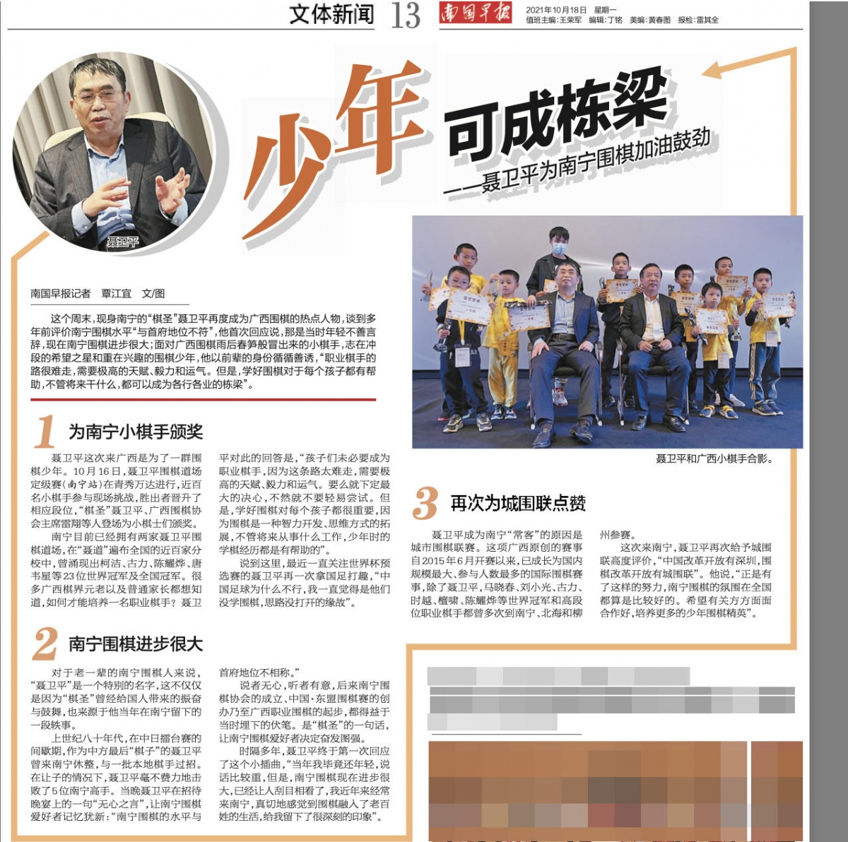 2021年,聂卫平接受本报记者独家专访。 而此间的人们承认,广西围棋后来的发展与他息息相关——就是因为“棋圣”一句话,一群人决定“连夜出发”。广西围棋协会成立、中国—东盟围棋赛在南宁创办,乃至广西职业围棋从零开始起步、城市围棋联赛从南宁走向世界,都得益于当时埋下的伏笔。 风轻轻吹过了历史,翻过了厚重一页。从今以后, 很难再出一个“棋圣”了——人工智能突飞猛进,“阿尔法狗”一马平川,不管是李世石还是柯洁,人类早就溃不成军。 或者,我们也不需要一个新的“棋圣”了。科技创新,百业俱兴,大国已然崛起,民族挺直了脊梁,人们依然信奉着奥林匹克的永恒追求:“更高更快更强”,但体育无需承载更多胜负之外的意义,不再需要某一场比赛、一时的成败,来赋予民众信心。 每个时代都有不同的棋局,江湖虽然远去,但梦想越来越近,每个人都很笃定: 是的,我们会赢。 |