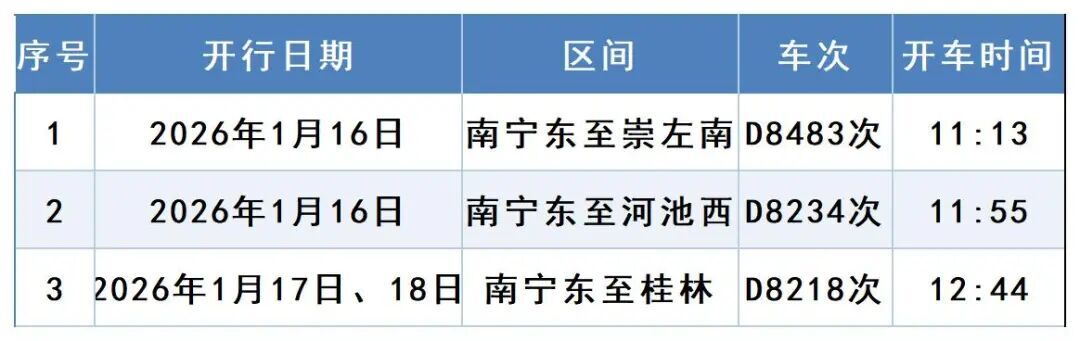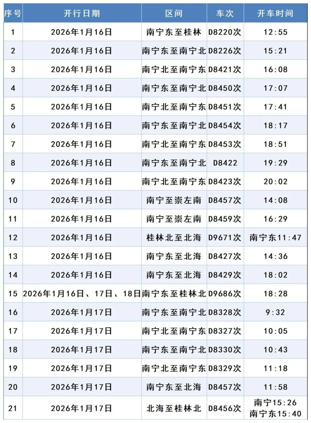 1月15日,记者从国铁南宁局南宁车站获悉,随着广西各大高校陆续放假,学生客流明显增多,为应对客流高峰,南宁车站动态调整运力,1月16日至1月18日期间加开前往南宁北、北海、崇左南、桂林等方向的动车组21列,恢复开行崇左南、河池西等方向动车组3列,最大限度满足学生群体返乡需求。车次详情请查询铁路12306官方网站,如有变化请以车站当日公告为准。