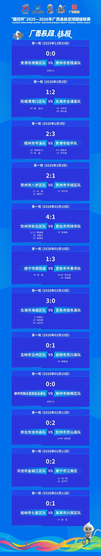 1月10—11日,“国控杯”2025—2026 年广西县级足球超级联赛(以下简称广西“县超”联赛)大区赛首轮12场赛事已全部结束,桂东、桂南、桂西、桂北四大赛区24支球队完成首秀。赛事既展现了广西县域足球的竞技活力与战术碰撞,也通过攻防两端的精彩演绎、球员的拼搏姿态,传递出鲜明的地域体育特色,为八桂大地的足球爱好者献了多场精彩纷呈的绿茵对决。