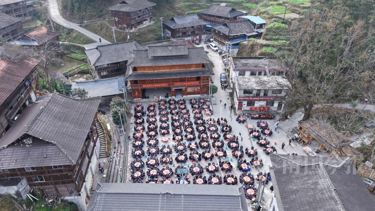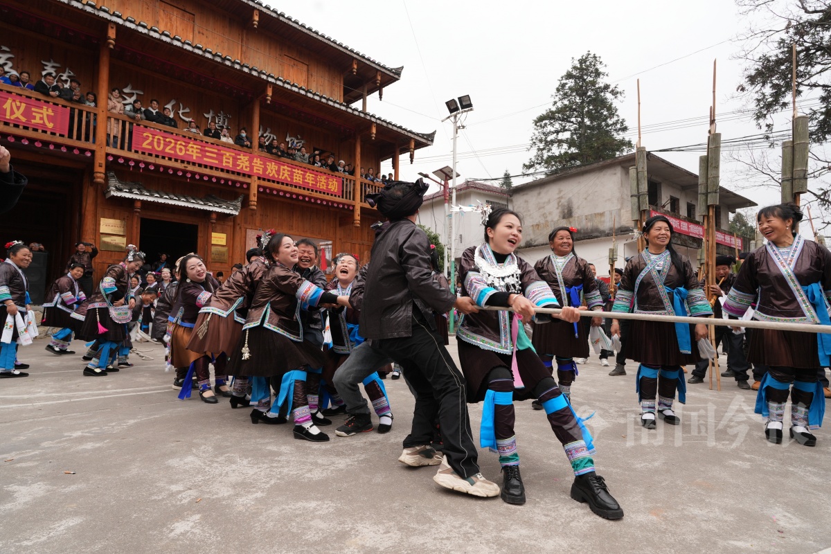 1月15日,在柳州市融水苗族自治县杆洞乡尧告村大寨屯,当地苗族同胞身着节日盛装,载歌载舞,共同庆祝融水苗族拉鼓文化博物馆开馆,并欢庆苗年。