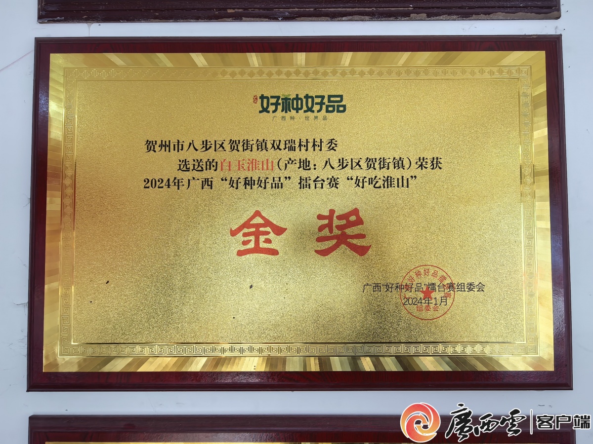 刘泽辉日常工作。梁伟 摄 从滞销困境到产业腾飞 时光回溯至2012年。一场台风过境,双瑞村千亩蔬菜基地遭遇洪涝,苦瓜严重滞销,价格断崖式下跌,村民眼看苦瓜烂在地里,束手无策。面对危机,刘泽辉挺身而出,他多方联络外地经销商,甚至毅然承诺:“赚了算你们的,亏了由我来承担!”这份掷地有声的担当,打动了客商,也稳住了民心。短短数日,15万斤滞销苦瓜销售一空,市场价格逐步回升。 这场“苦瓜危机”让刘泽辉深刻认识到:传统农业靠天吃饭、单打独斗的模式难以为继,必须推动产业升级,打造自主品牌。他将目光投向村里另一项传统作物——淮山。长期以来,淮山种植受限于连作障碍,品质参差、效益低下。刘泽辉带头成立淮山协会,组织村民外出学习,邀请专家进村指导。经过反复试验,他创新推出“打洞灌沙、定向种植、客土栽培”技术,一举攻克技术难题,使淮山品质和产量实现质的飞跃。 技术突破只是起点,品牌化才是出路。刘泽辉积极推动“贺街淮山”申报国家地理标志产品认证,参与制定栽培技术规程,推动标准化种植。2024年,在广西“好种好品”擂台赛上,“贺街白玉淮山”“贺街红皮淮山”分获金奖、银奖;同年,“贺街淮山”正式获国家地理标志产品保护,品牌价值日益凸显。如今,双瑞村及周边区域淮山种植面积超2万亩,形成连片产业带,“淮海”之名不胫而走。