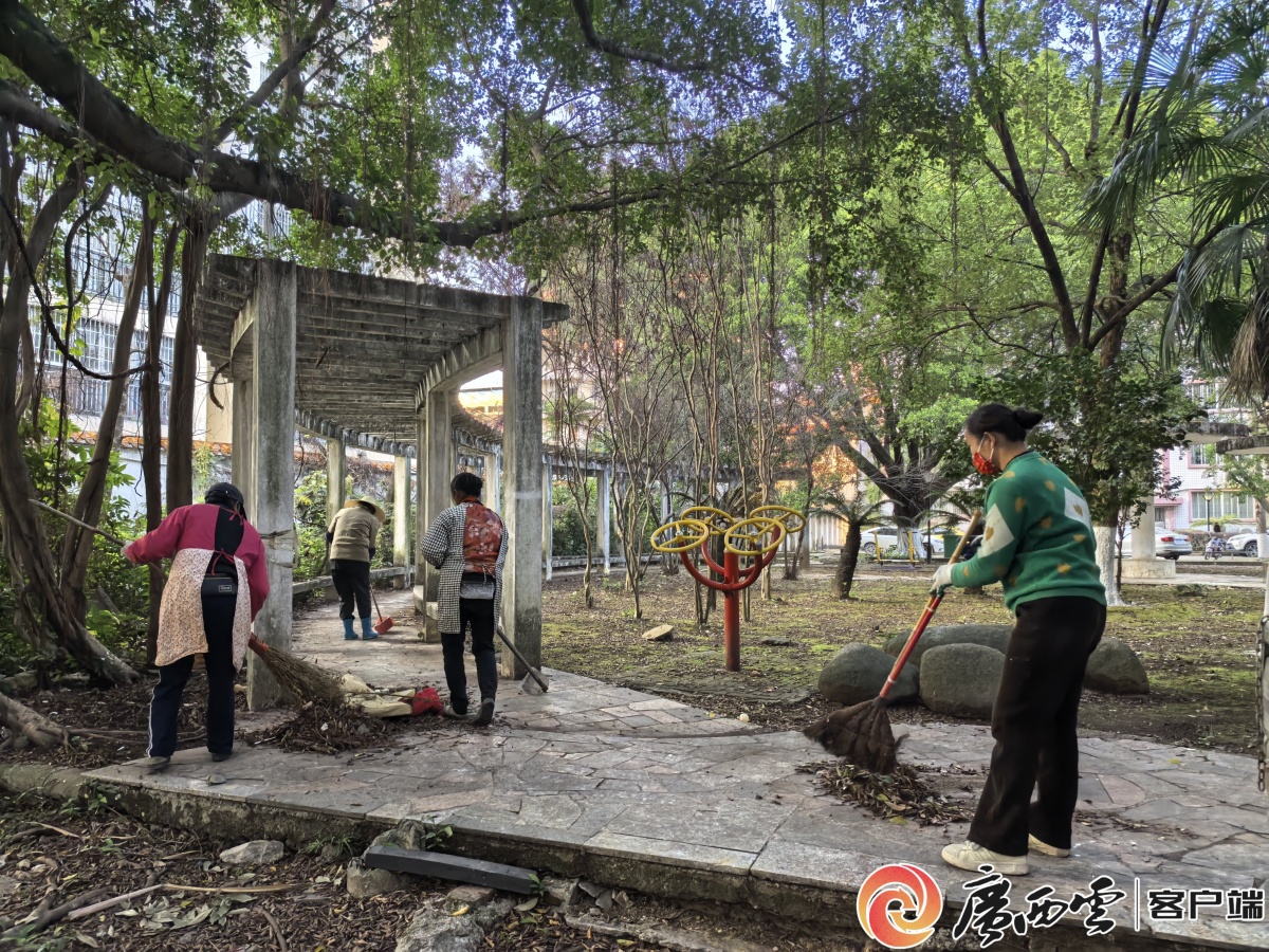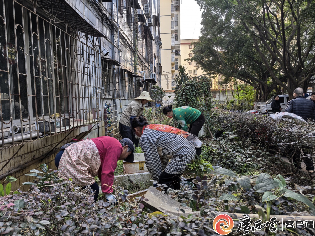 社区工作人员入户递上《致居民的一封信》。毛俊人 摄 共识聚起来,方案优起来。一场露天的“现场办公会”,让老县委大院的改造蓝图越绘越清晰。八步街道牵头,市创城办、区执法局、区机关后勤服务中心、专业公司和居民代表齐聚小区空地,大家用脚步丈量每一个角落,精准界定权责边界,科学核定工程量,把清理杂陈、规划车位、根治“牛皮癣”等每一项任务都敲定得明明白白。最终形成的《环境综合整治实施方案》,成了人人认可的“施工图”,也让这场改造,真正变成了大家的“共同作业”。 一场家园焕新的“攻坚战”正式打响。年轻人挥锹铲土清理荒芜花坛,年长者弯腰捡拾角落的烟头纸屑,包联单位志愿者和居民们并肩作战,清运车一趟趟往返,累计清运寄存垃圾190吨、17车积存垃圾,清理商业小广告50余处,更新公益广告2处,更新停车位划线85个,新增规划停车位86个。曾经被杂物挤占的公共空间重见天日,斑驳的墙面换上了“新装”,乱停乱放的车辆也有了专属“家园”。看着眼前的变化,居民韦文言忍不住感慨:“垃圾清走了,心里头也跟着透亮了!”