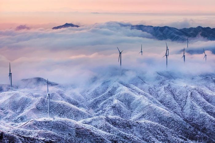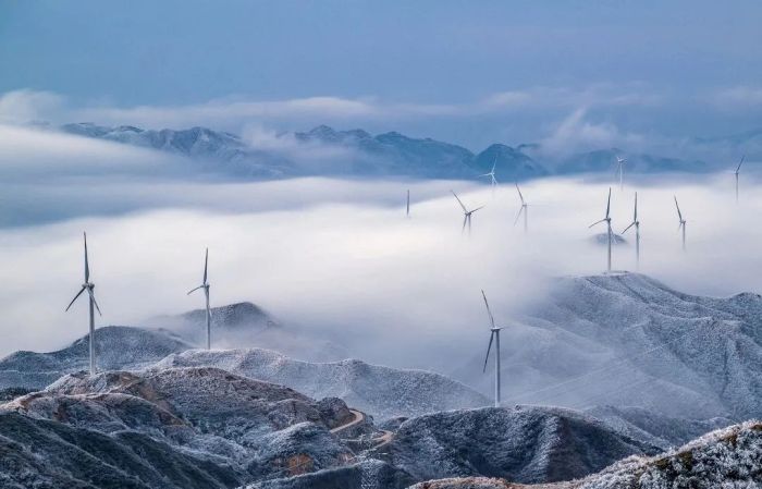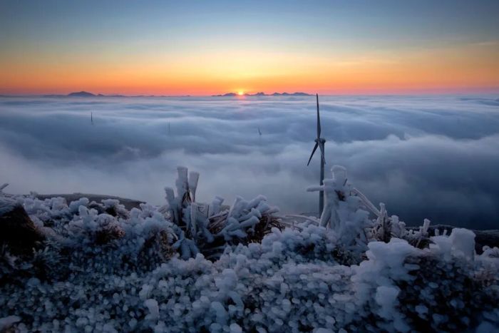 图/黄祥志 摄 海拔1600-1800米的十里平坦,有着开阔的高山草场,数不清的大风车在冰雪中缓缓转动,宛如动画片里的场景。这里的雾凇磅礴大气,视野开阔,云海流转间,雾凇点缀其间,仿佛一幅流动的水墨画。适合自驾、越野爱好者前往,沉浸式感受云端秘境的苍茫与壮阔。