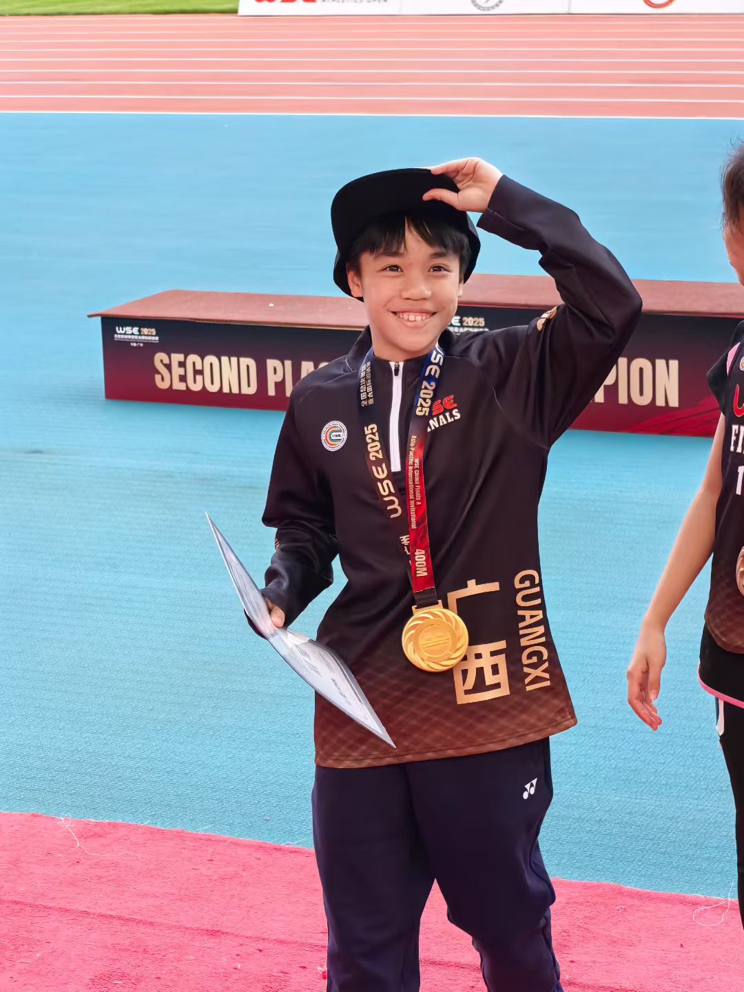 苏宥伊获奖后很开心。 “她训练总会比别人早到,提前放松肌肉、做好拉伸。她最大的优势就是速度和耐力出众,后程冲刺爆发力远超同龄人。”迈靖田径体育俱乐部教练黄志森告诉记者,苏宥伊自从投身田径训练后,每天晚上都会坚持加练5公里。总决赛前一个月的每个周末,凌晨5时她就起床赶去南宁训练,回家后还会自觉加练半小时核心力量,“为了节省时间,她主动剪短头发,这份自律与执着,正是她突破纪录的关键”。