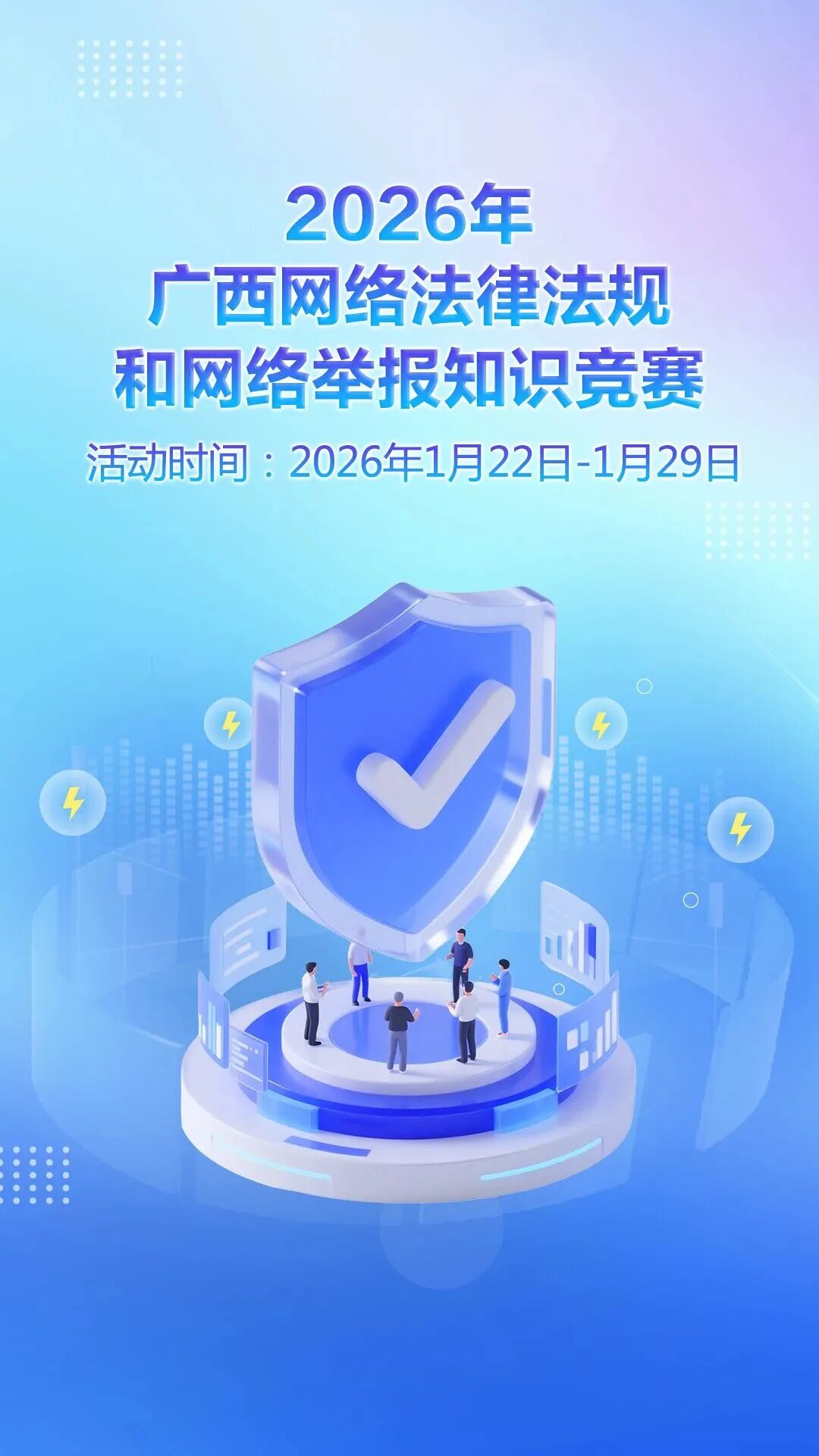 你是否刷到过真假难辨的网络信息 却不知如何筛选? 你是否遭遇过违法不良信息骚扰 却不懂如何举报?你是否想学习网络法律、守法用法 却找不到捷径? 现在,福利与干货双收的机会来了! 2026年广西网络法律法规 和网络举报有奖知识竞赛 1月22日火热开启! 既能有效学习 网络法律法规、网络举报、网络侵权 网络辟谣、安全防护等硬核知识 还能轻松赢取微信现金红包 最高可达50元! 还等什么? 快快加入这场“知识变现”的趣味挑战吧! 活动目的 本次知识竞赛由广西网信办联合广西云数字媒体集团重磅推出,帮助网民朋友学习互联网法律法规,掌握互联网违法和不良信息类别、举报渠道,引导广大网民树立“不造谣、不信谣、不传谣”的理念,学会文明上网、安全上网,共同筑牢网络空间安全防线。 活动时间 2026年1月22日10:00—1月29日23:59 参赛方法 ①扫描下方二维码或搜索“广西网络举报”微信公众号并关注