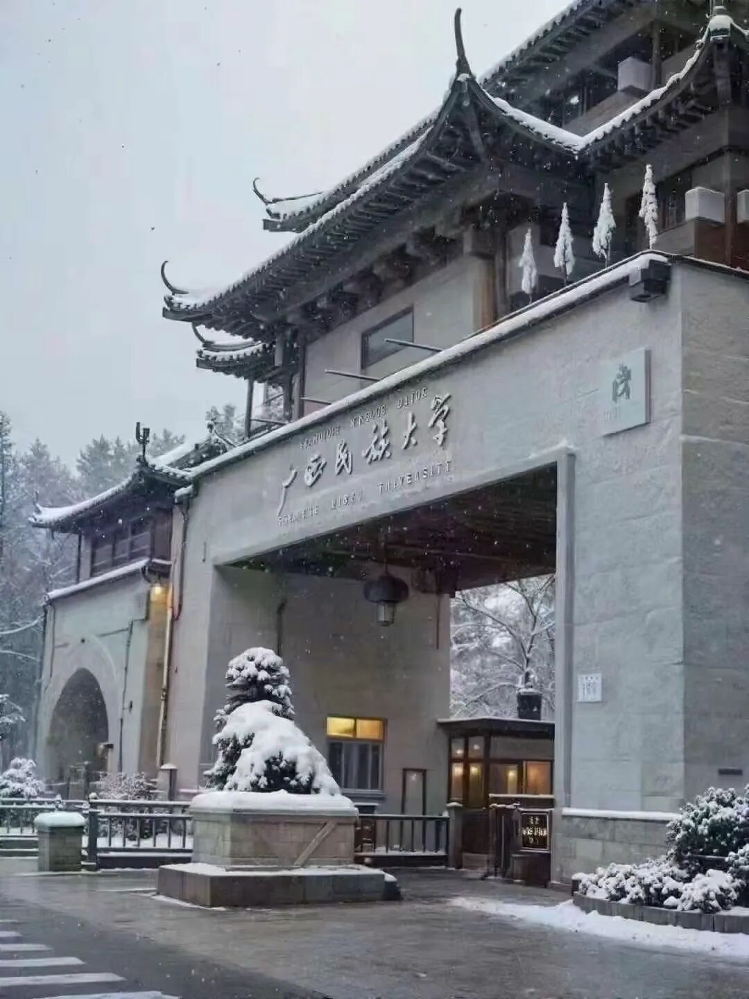 还有一些南宁“雪景”图片和视频 迅速传播 画面中 广西民族大学等地标建筑 一片“银装素裹” 看起来有模有样