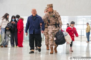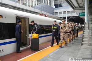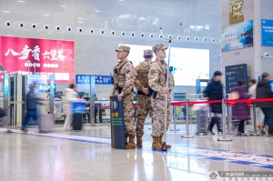 广西新闻网柳州2月3日讯(通讯员 赖治华 马文杰 穆万琼)春运首日,柳州城区迎来首批返乡客流高峰。为筑牢春运安全防线、保障旅客平安出行,武警广西总队柳州支队与驻地公安部门紧密协同、联勤联动,采取定点警戒、徒步巡逻相结合的方式,开展联勤武装巡逻。