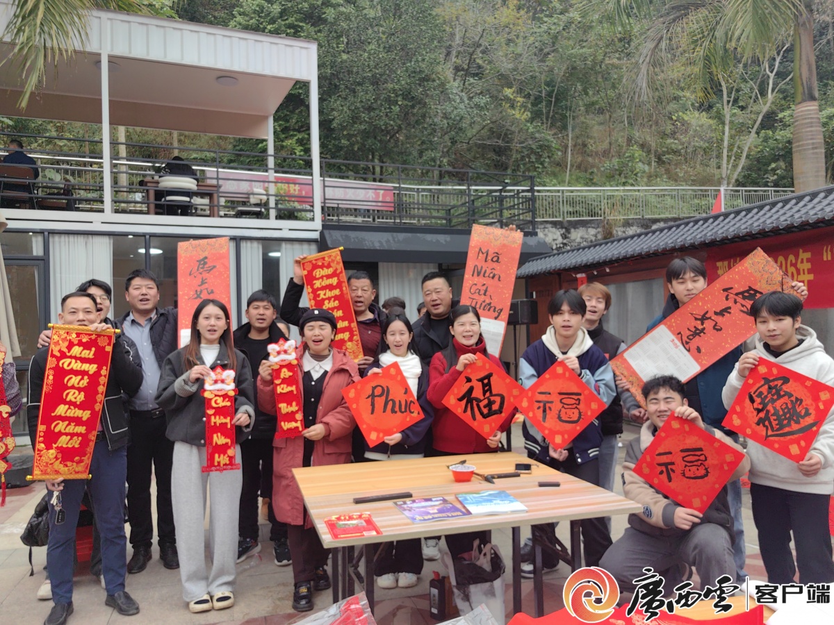 中越书法爱好者同台挥毫献艺,互送新春祝福。视频摄制:记者 陆旺 通讯员 凌箐璐 新春将至,那坡县组织开展“翰墨书香润边关 中越同心迎新春”文化惠民活动。2月11日至13日,文艺志愿者、书法家走进平孟镇、百南乡等边境一线,为当地群众和中越边民送上别具特色的“文化年货”。 在平孟口岸国门文化广场,中越两国书法爱好者同台挥毫,围绕中越友好、民族团结、新春吉祥等主题,现场创作春联、“福”字和挂历,并免费赠送。一幅幅大红春联吸引众多边民驻足欣赏、领取。越南河内大学学生农秋河用越文写下“中越友好”,她表示:“书法是我们共通的语言,这些春联是两国人民友好情谊的见证。”