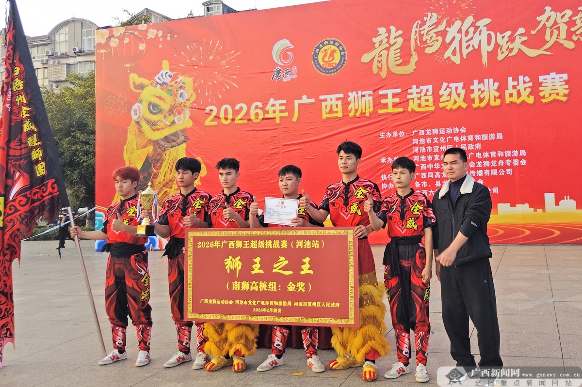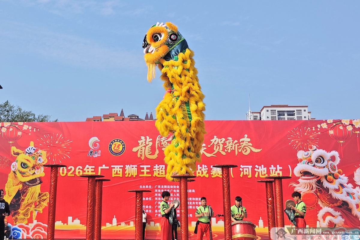 醒狮在高桩上腾挪灵动、憨态可掬。 赛事由广西龙狮运动协会、河池市文化广电体育和旅游局、河池市宜州区人民政府联合主办,宜州区文化广电体育和旅游局等单位承办,旨在聚焦南狮传统技艺与竞技水准,设置南狮高桩精英组、南狮传统社会组两大组别,共吸引来自桂、粤、黔等地14支顶尖龙狮队伍、160余名运动员同台竞技。 赛场上的选手们各显神通,在铿锵锣鼓声与观众喝彩声中,演绎了 “采青”“高台饮水” 等经典舞狮动作,将南狮的刚劲与灵动展现得淋漓尽致。精彩的龙狮运动烘托出浓郁的年味,引得市民游客纷纷拿出手机拍摄记录,现场一派热闹祥和景象。