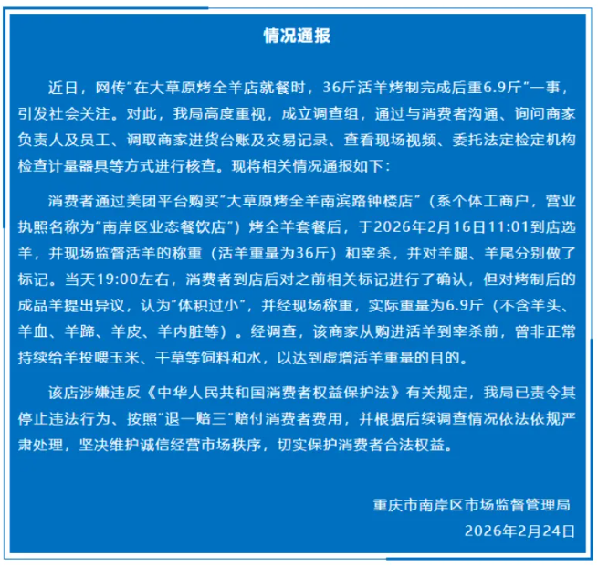 新闻眼近日,重庆消费者王女士在“大草原烤全羊南滨路钟楼店”,花费1188元选购36斤活羊,经现场监督处理后,烤制完成仅重6.9斤,缩水超80%,引发全网关注。随后,重庆市南岸区市场监督管理局发布通报,明确商家存在宰杀前非正常投喂饲料和水、虚增活羊重量的行为,已责令其“退一赔三”并停止违法行为。本期广西云三连评和您一起探讨如何守护节日放心消费环境—— 重庆烤全羊事件中,市场监管部门的快速处置值得肯定。责令退一赔三、立案调查,及时为消费者讨回公道,也给无良商家敲响了警钟。这起事件也印证了,节日消费市场的平稳,离不开监管的硬手段和消费者的维权意识。