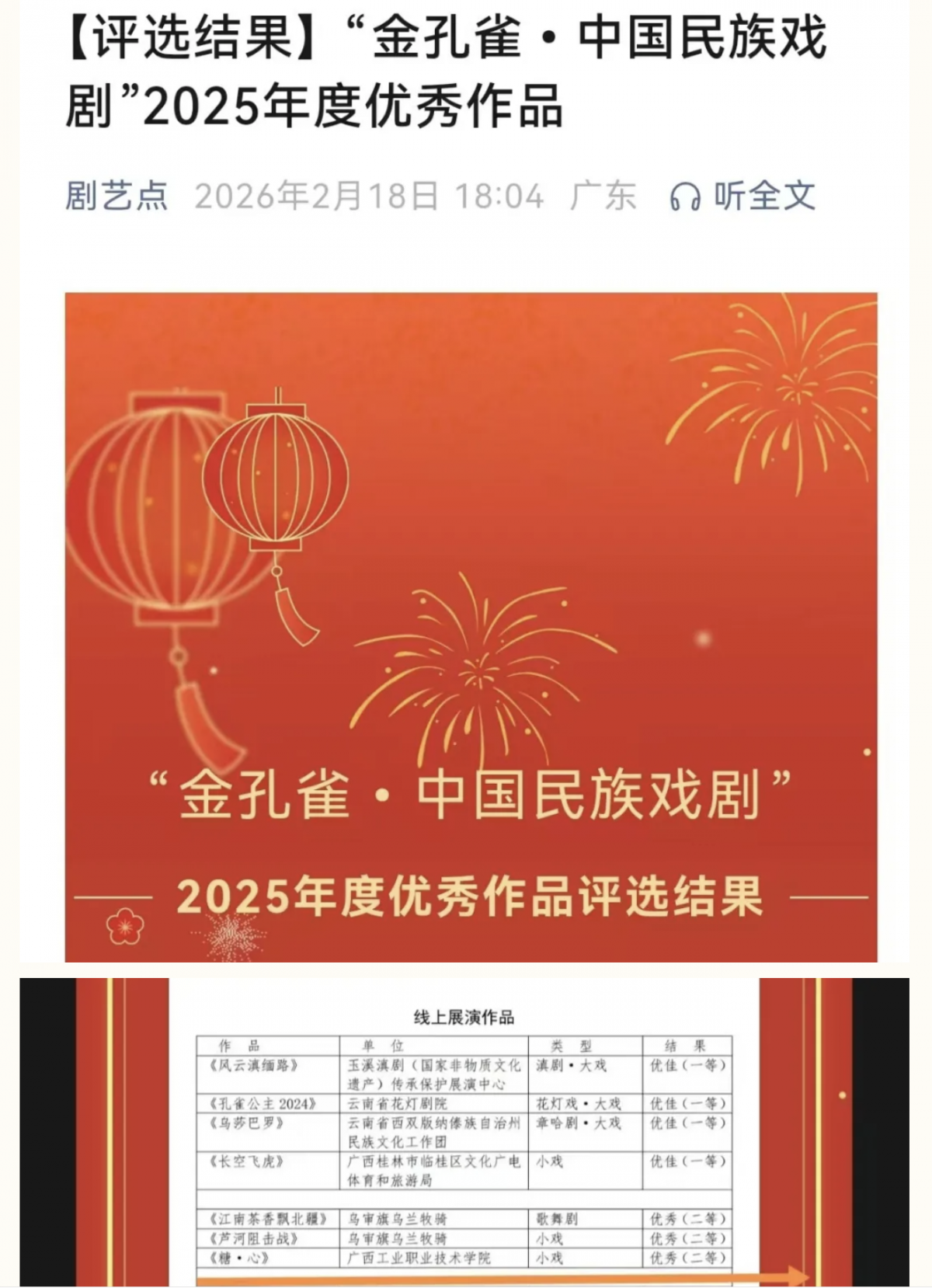 评选结果。 据了解,“金孔雀”奖项前身为1985年创办的“全国少数民族题材戏剧剧本孔雀奖”,由原文化部等联合发起,2024年重启后成为文化和旅游部主管的国家一级学会——中国少数民族戏剧学会主办的权威赛事,评审标准严苛到“千里挑一”。本届评选吸引了全国专业艺术院团、知名艺术院校选送的京剧、昆曲、越剧等数十个剧种作品踊跃参与,业界专家组成的评审团层层筛选,最终评出优佳、优秀、优良三个等级奖项,《糖·心》能在专业军团中杀出重围,实属不易。