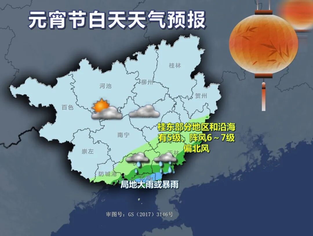 明天白天 沿海三市、玉林等市 依然有小到中雨 局地大雨或暴雨 其它地区多云到阴天