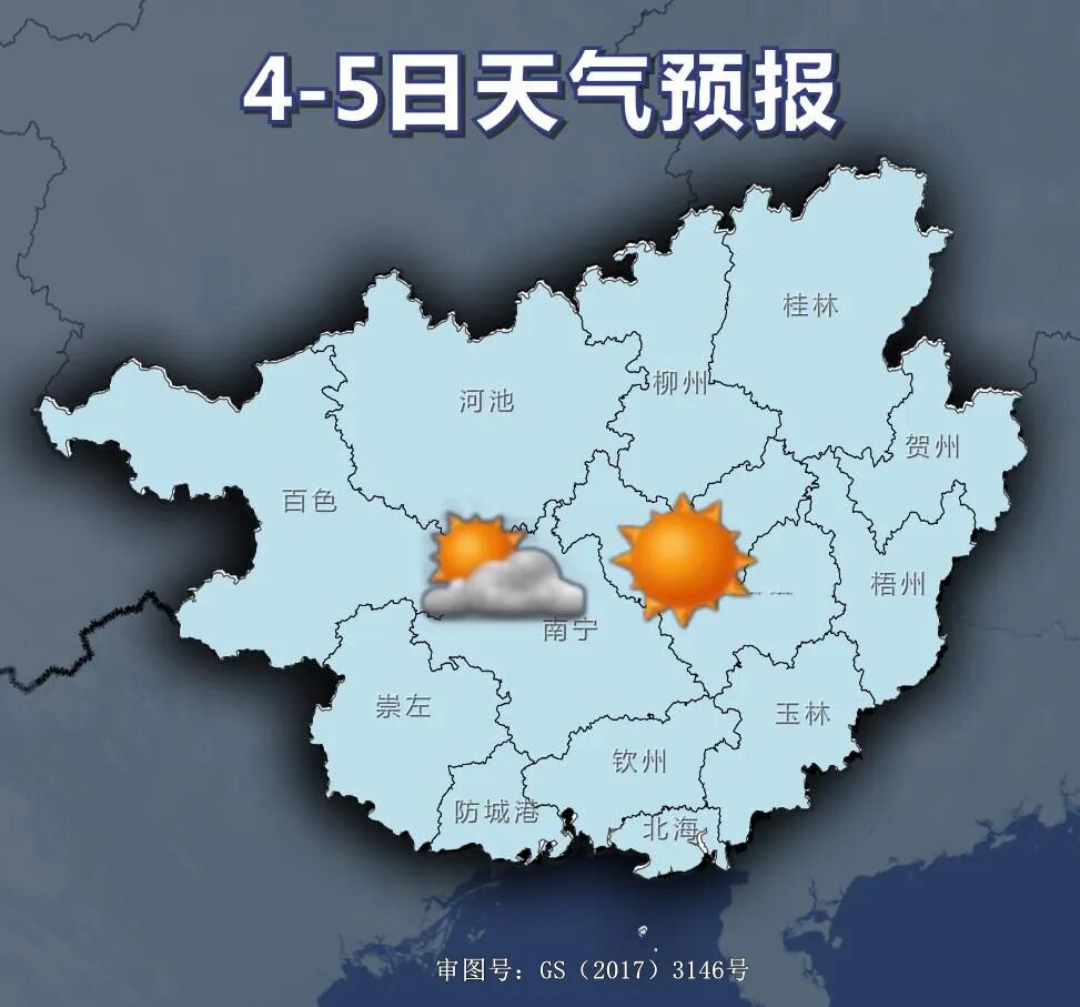 3日晚上到5日白天 雨水退去 阳光现身 全区将是多云到晴的好天气 温馨提示 1.阴雨天气路面湿滑、视线不佳,出行请格外留意交通安全。驾车出行时请降低车速、谨慎驾驶,与前车保持安全距离,及时开启车灯,确保行车安全。 2.请密切关注局地强降雨、强对流天气可能带来的风险,遇到大风、雷电时,不要在大树、广告牌、电线杆、老旧房屋及临时搭建物附近停留或躲雨,远离河道、低洼地段、山体边坡等区域,严防山洪、滑坡等灾害发生。 3.同时请提前检查并收好阳台、窗台上的花盆、杂物、衣物等易坠物品,避免被大风吹落伤人或损毁财物,守护自身和他人安全。 未来三天天气预报 广西气象台3月2日17时发布预报: 陆地天气预报 今天晚上,防城港、钦州、北海、玉林、崇左等市和梧州市南部及百色、河池两市北部阴天有小雨、局地大雨或暴雨,其它地区多云到阴天。 明天白天,防城港、钦州、北海、玉林等市有小到中雨、局地大雨或暴雨,其它地区多云到阴天。 今天晚上到明天白天,桂东部分地区和沿海有5级、阵风6~7级的偏北风。 森林火险气象等级:桂西部分地区3级,较高火险;其它地区2级,较低火险。 南宁市:今天晚上到明天白天,小雨转多云,东北风2~3级、阵风5~7级,最低气温14℃,最高气温22℃。 3日晚上到5日白天,全区多云到晴。 强风警报和海洋天气预报 北部湾海面:今天晚上到明天白天,多云到阴天有分散小雨,南转北风4~5级、阵风6级;2日晚上到3日白天,中雨、局地大雨或暴雨,东北风逐渐加大到5~6级、阵风7~8级;3日晚上到4日白天,多云到晴,东北风5~6级、阵风7级。合浦到东兴沿海各地台风警报站,所挂的强风信号一号风球不改变。