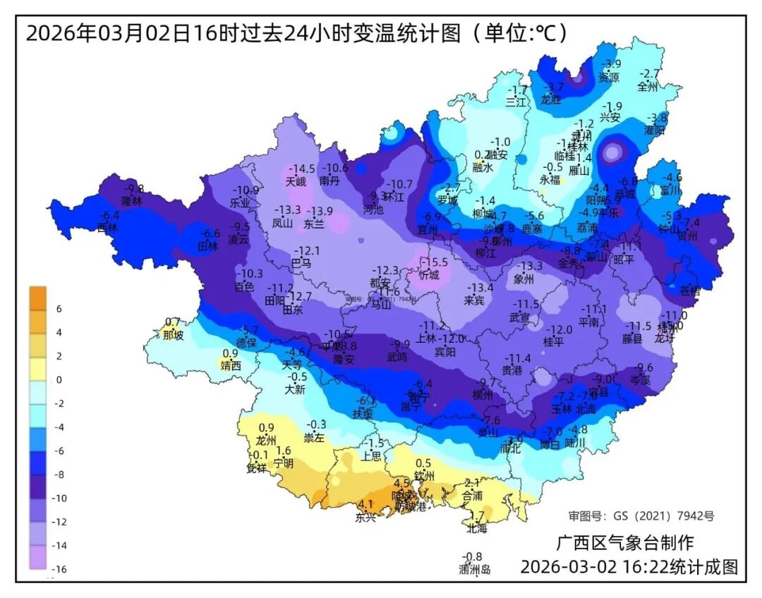 不过 随着冷空气的继续渗透 桂西南和沿海的气温 也会“冷静”下来 雨水则会进一步南压 局地雨势较强 不仅如此 今天(3月2日)晚上到明天白天 桂东部分地区和沿海 有5级、阵风6~7级的偏北风 广西天气趋势