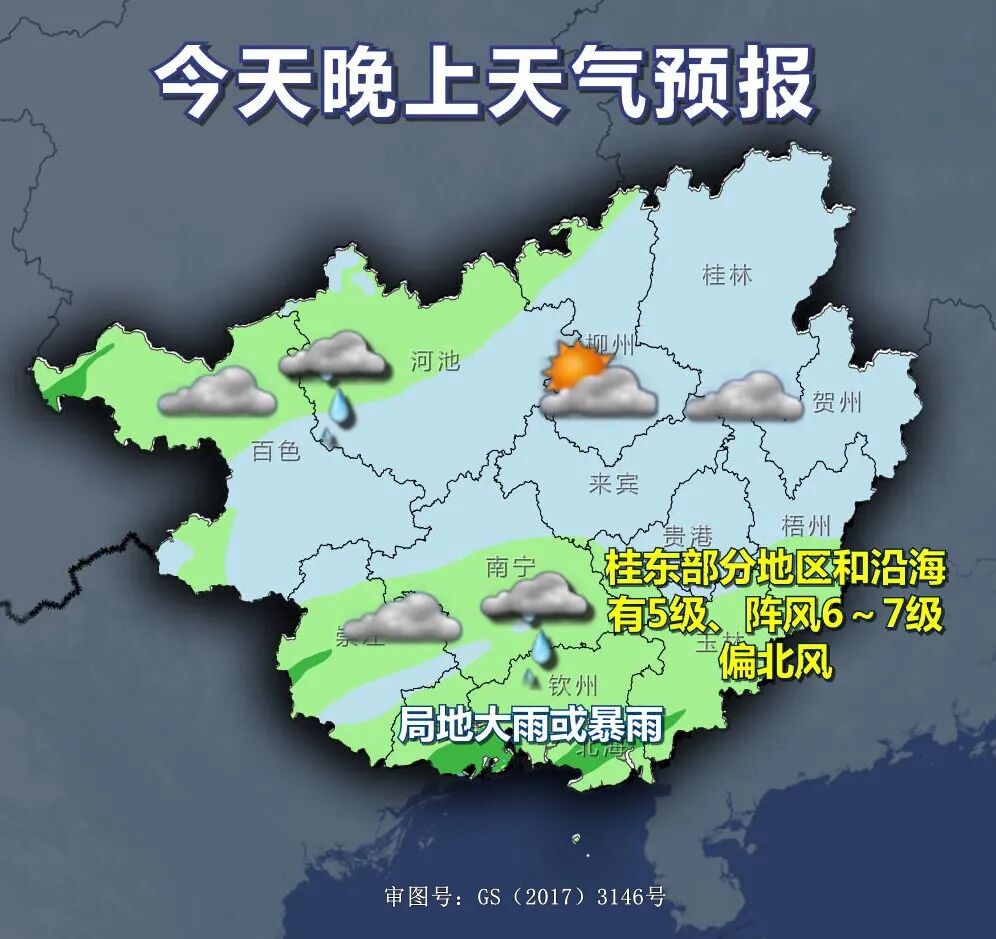 今天晚上 沿海三市、玉林、崇左等市 和梧州市南部 及百色、河池两市北部 阴天有小雨 局地还会出现 大雨或暴雨 而广西的其它地区 则是多云到阴天