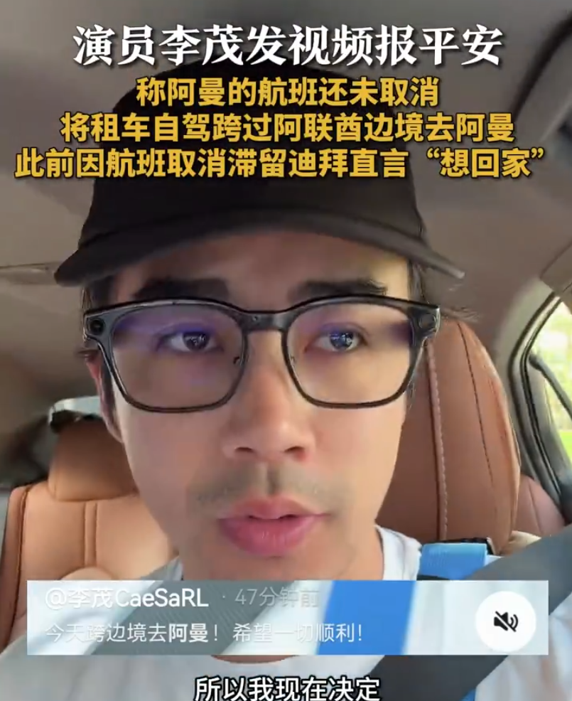 3月2日,前“至上励合”组合成员、演员李茂发视频报平安称“今早6点时候收到国航的消息,飞机又取消了,但是阿曼的航班还没有取消。所以决定临时租一个可以跨境的车开到阿曼”。 3月1日,李茂曾发布视频称,在迪拜遭遇航班取消无法回国的情况,直言“想回家”。据报道,演员李茂与妻子弦子在迪拜度假期间,因中东战事升级导致机场遭导弹碎片波及、航班全面停运,全家被迫滞留。