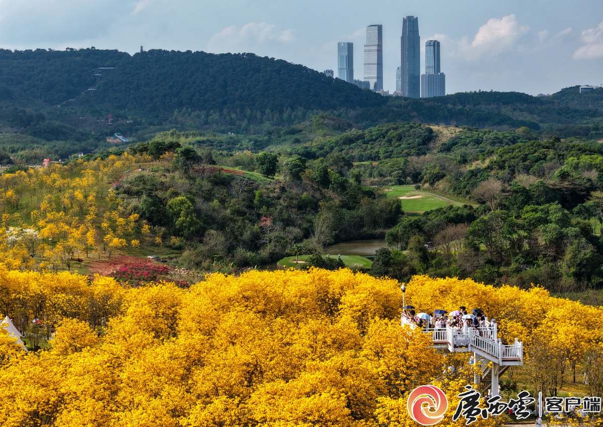 游人在观景台上观赏黄花风铃木花海和城市景观 周军 摄