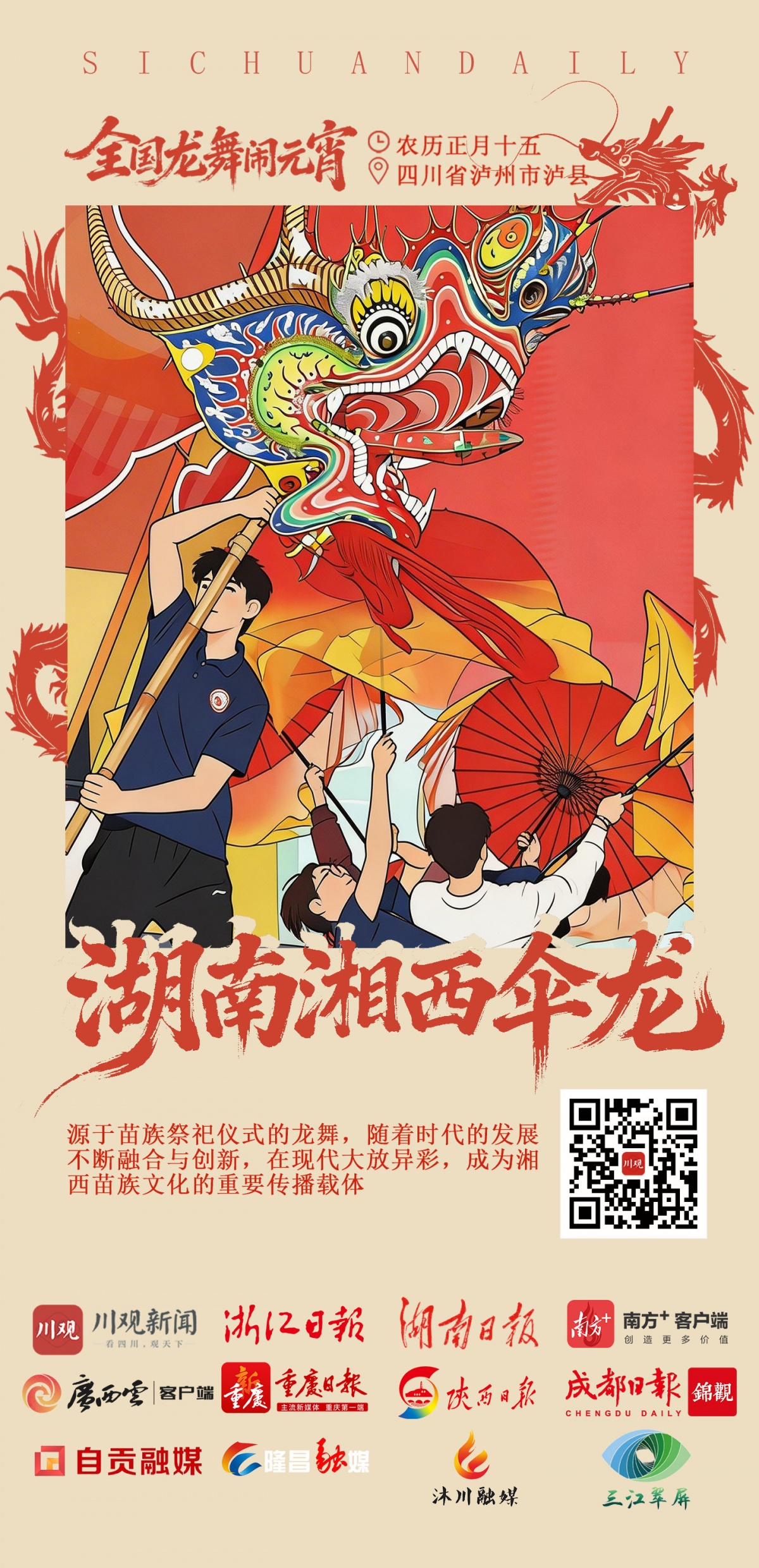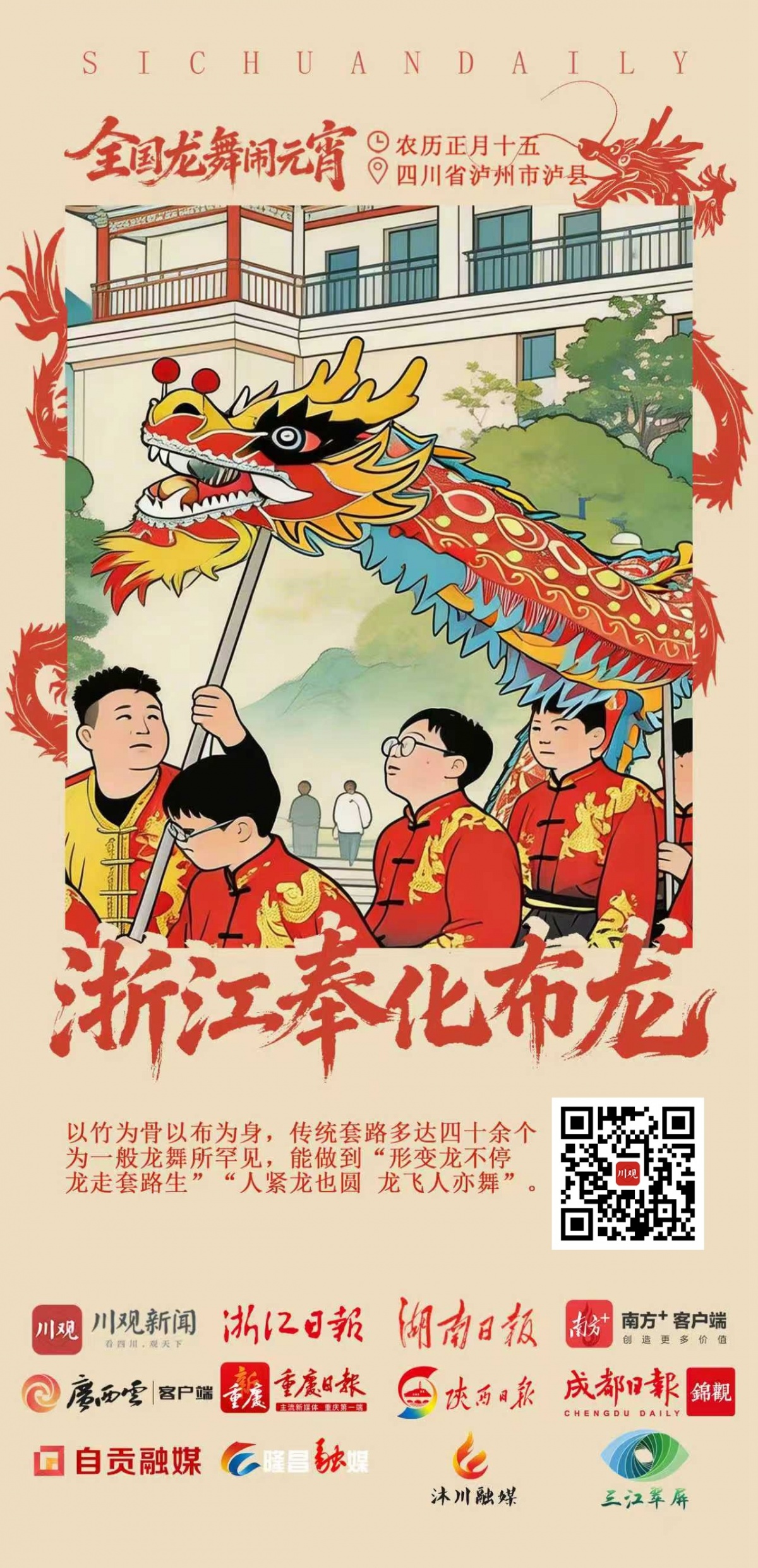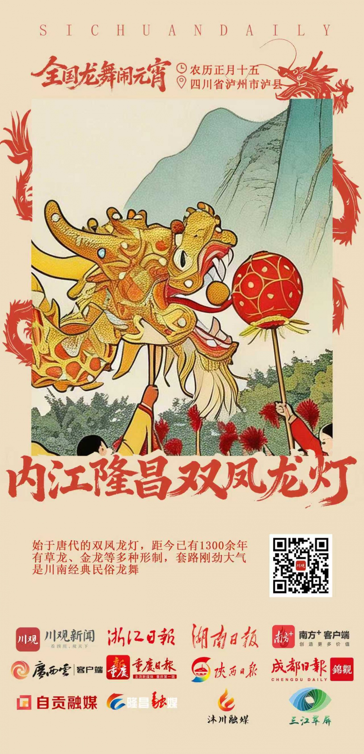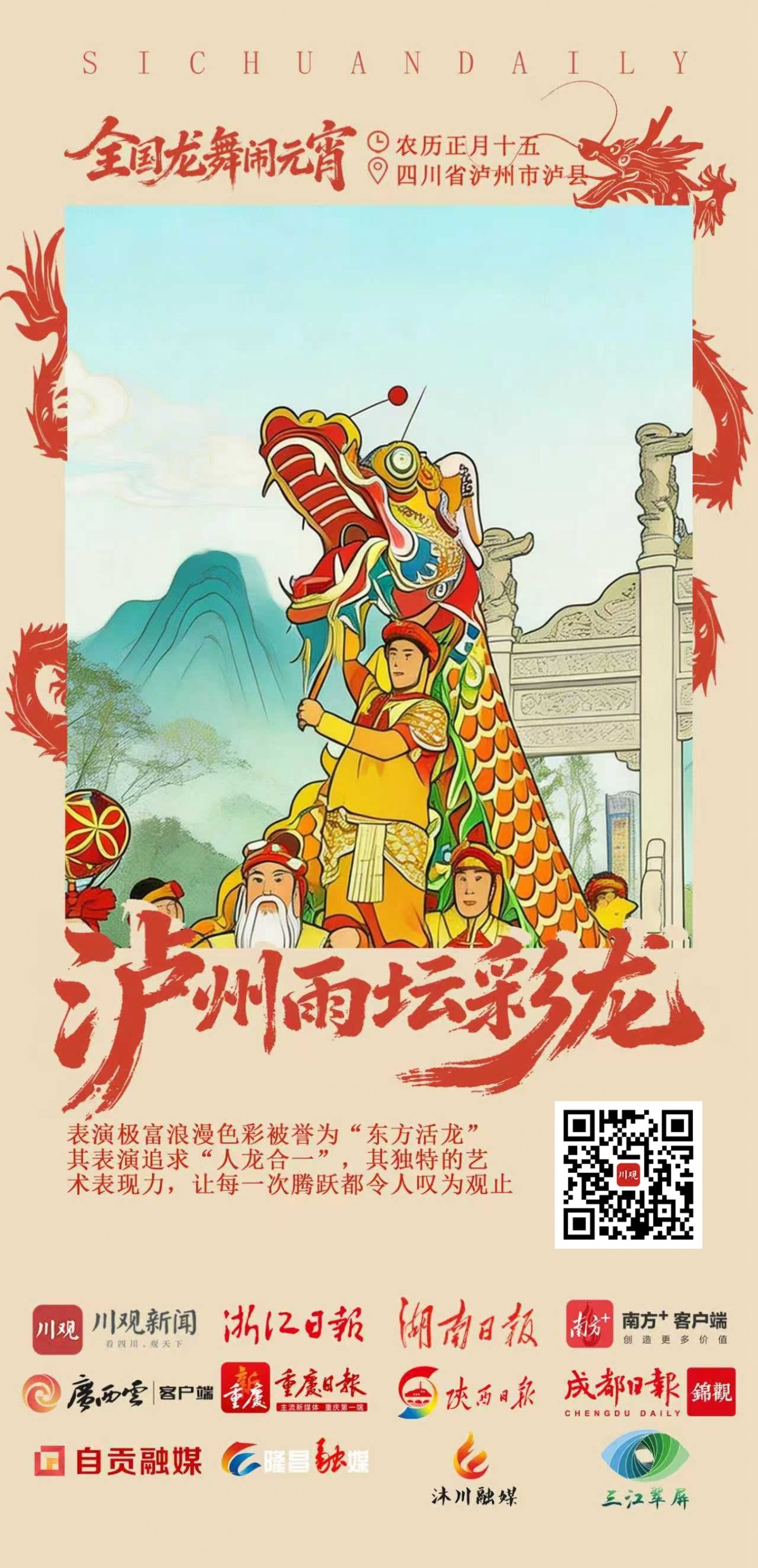 看龙舞 是专属中国人的元宵节仪式感 早在汉代 就有关于舞龙求雨的明确记载 过去,山川相隔 各地龙舞各自生长,鲜能一见 如今,山海相连 一口气看遍全国龙舞,近在眼前 全国龙舞“天花板”级battle来了 3月3日,农历正月十五 2026全国龙舞闹元宵活动 在“中国龙文化之乡”—— 四川省泸州市泸县正式启动 这些龙舞“天团”都来自哪儿? 有远道而来的浙江奉化布龙、湖南湘西伞龙、广东中山醉龙、广西宾阳炮龙、重庆铜梁焰火龙、陕西龙江龙舞等南北特色名团,也有本次活动的领衔队伍泸州雨坛彩龙,携手成都黄龙溪荷花龙、乐山沐川草龙、宜宾李庄草龙、内江隆昌双凤龙灯、自贡花样八字龙等四川本土龙舞强队。诸多龙舞“天团”同台飙技,与观众近距离互动,让大家在锣鼓喧天、龙影翻飞中,感受非遗魅力与元宵盛景。 活动当天,既有来自全国龙舞领域专家和各地代表共话龙舞文化传承与发展,也有龙狮争锋·技艺展演,还有32支龙舞队伍全城巡游,万人同赏祥龙巡境场面。 线下活动热气腾腾,线上传播热辣滚烫。四川日报、南方日报、浙江日报、陕西日报、湖南日报、重庆日报、广西日报及省内成都日报、自贡融媒、内江隆昌融媒、宜宾翠屏融媒、乐山沐川融媒等联动传播,带你共赏这场元宵龙舞狂欢。 话不多说 让我们沿着历史经纬的脉络 一起开启这场全国龙舞大battle 唐丨四川泸州 雨坛彩龙