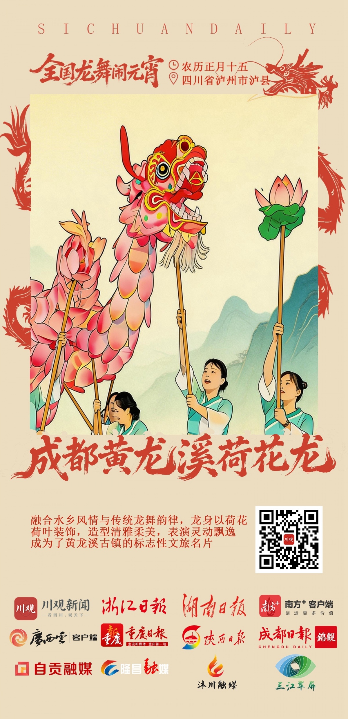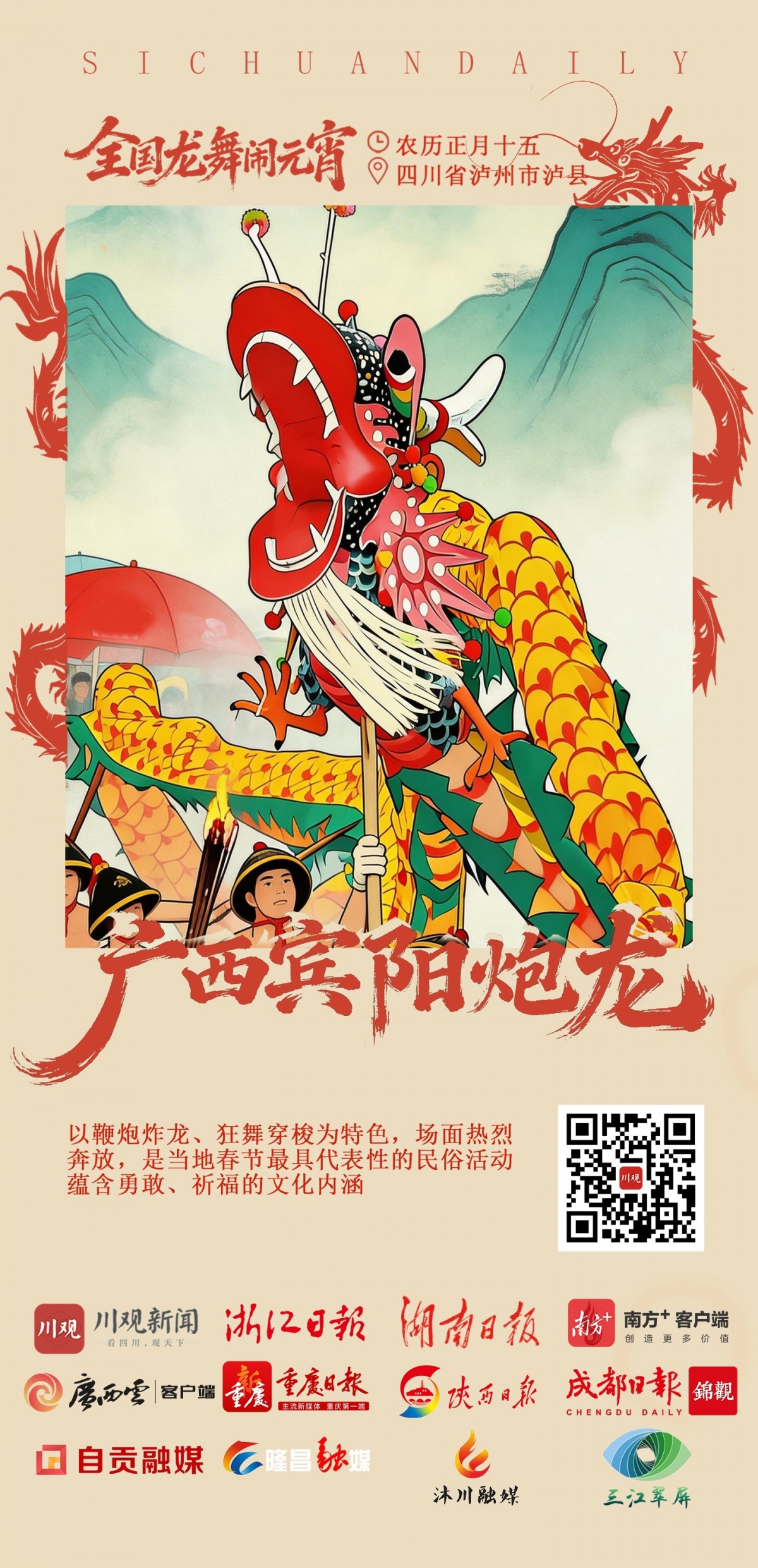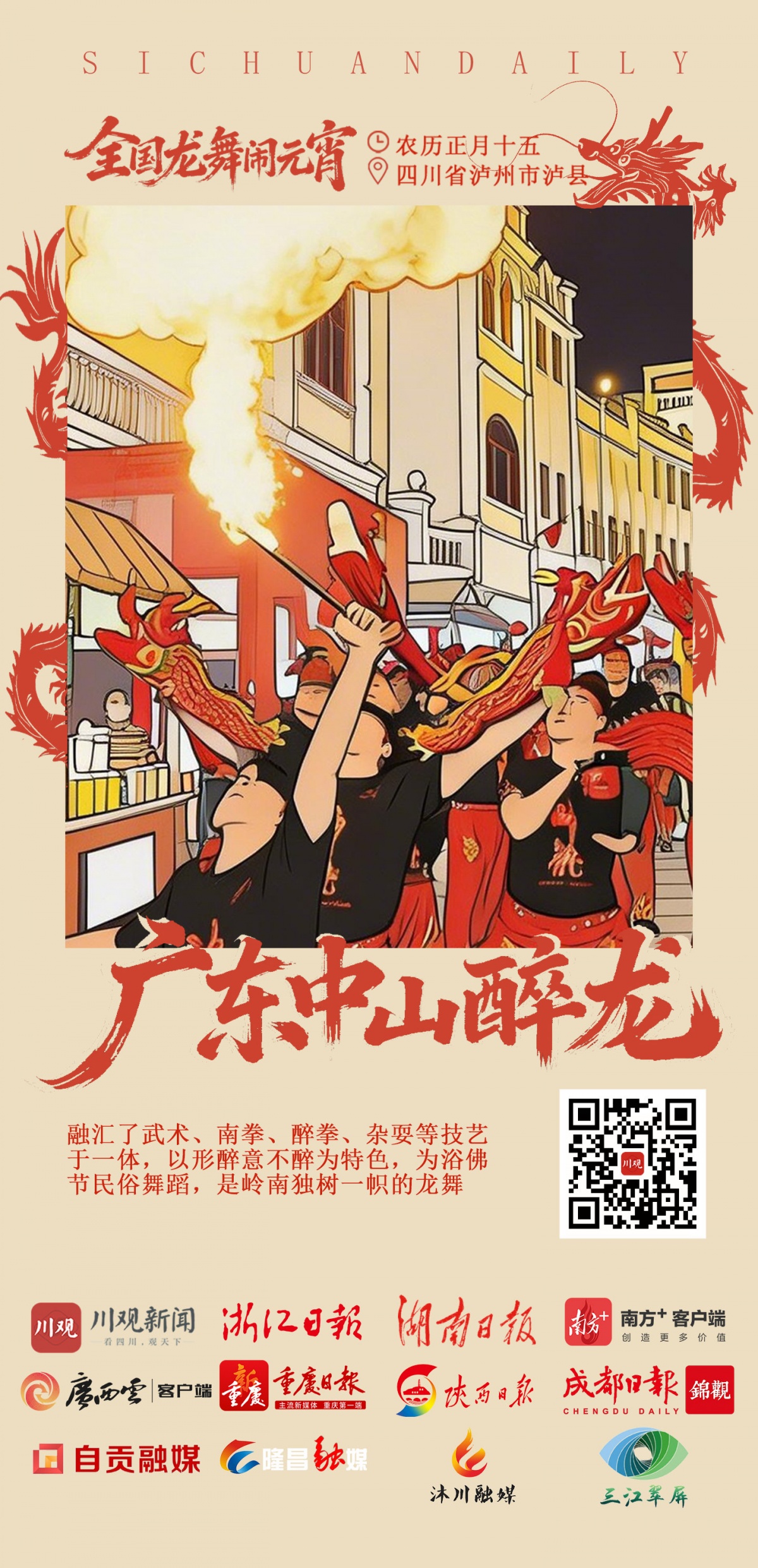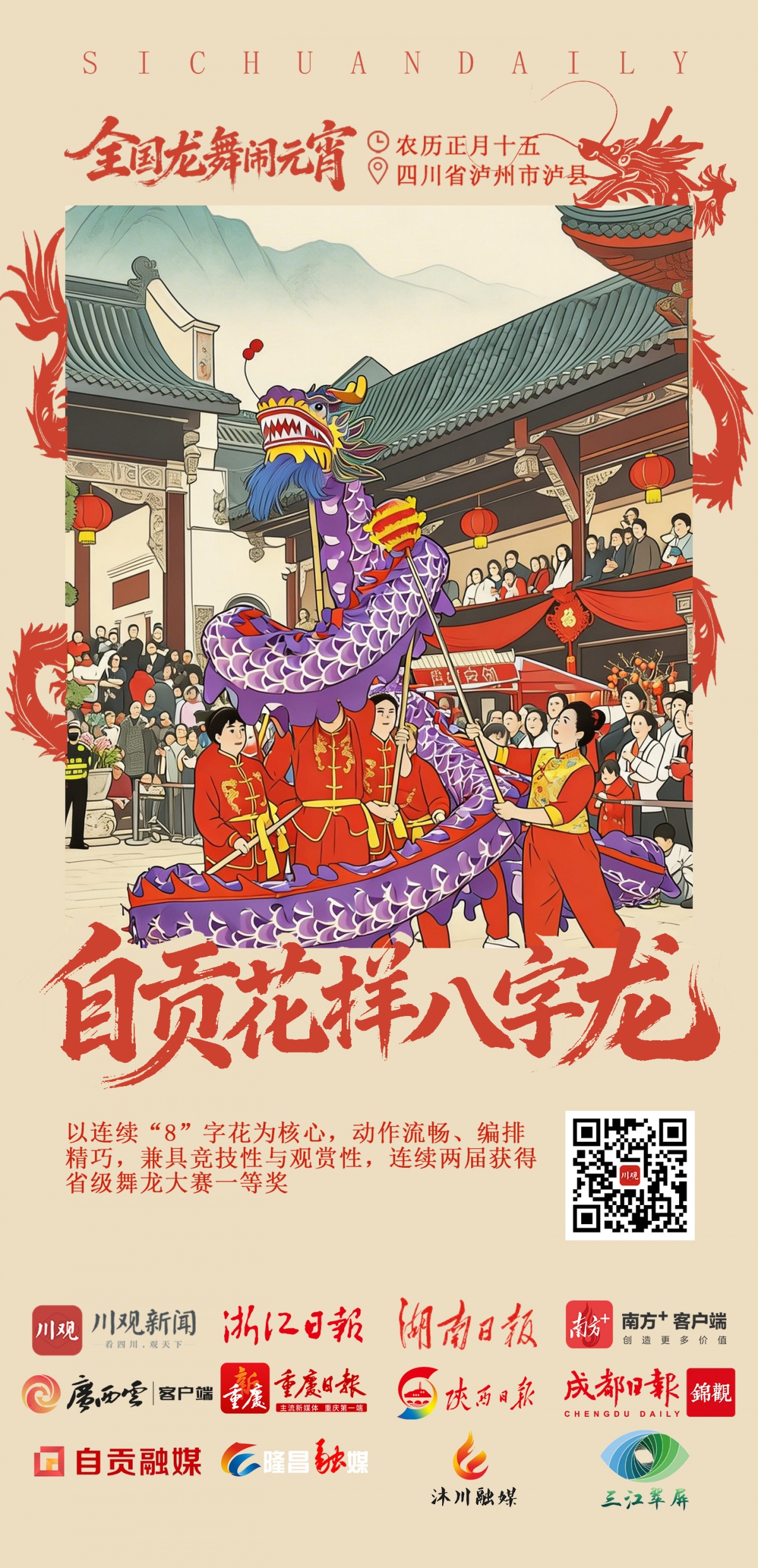 看龙舞 是专属中国人的元宵节仪式感 早在汉代 就有关于舞龙求雨的明确记载 过去,山川相隔 各地龙舞各自生长,鲜能一见 如今,山海相连 一口气看遍全国龙舞,近在眼前 全国龙舞“天花板”级battle来了 3月3日,农历正月十五 2026全国龙舞闹元宵活动 在“中国龙文化之乡”—— 四川省泸州市泸县正式启动 这些龙舞“天团”都来自哪儿? 有远道而来的浙江奉化布龙、湖南湘西伞龙、广东中山醉龙、广西宾阳炮龙、重庆铜梁焰火龙、陕西龙江龙舞等南北特色名团,也有本次活动的领衔队伍泸州雨坛彩龙,携手成都黄龙溪荷花龙、乐山沐川草龙、宜宾李庄草龙、内江隆昌双凤龙灯、自贡花样八字龙等四川本土龙舞强队。诸多龙舞“天团”同台飙技,与观众近距离互动,让大家在锣鼓喧天、龙影翻飞中,感受非遗魅力与元宵盛景。 活动当天,既有来自全国龙舞领域专家和各地代表共话龙舞文化传承与发展,也有龙狮争锋·技艺展演,还有32支龙舞队伍全城巡游,万人同赏祥龙巡境场面。 线下活动热气腾腾,线上传播热辣滚烫。四川日报、南方日报、浙江日报、陕西日报、湖南日报、重庆日报、广西日报及省内成都日报、自贡融媒、内江隆昌融媒、宜宾翠屏融媒、乐山沐川融媒等联动传播,带你共赏这场元宵龙舞狂欢。 话不多说 让我们沿着历史经纬的脉络 一起开启这场全国龙舞大battle 唐丨四川泸州 雨坛彩龙