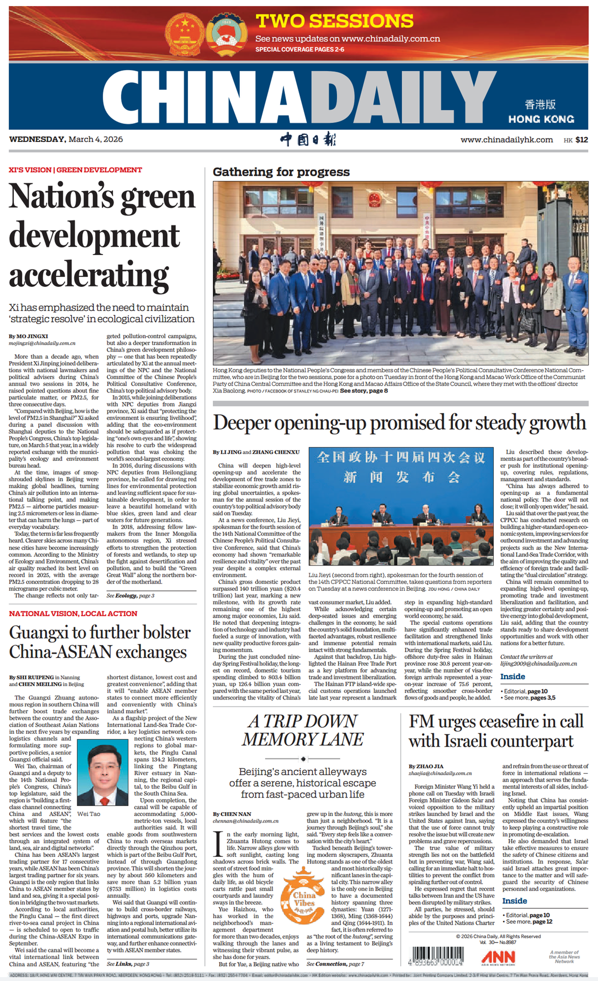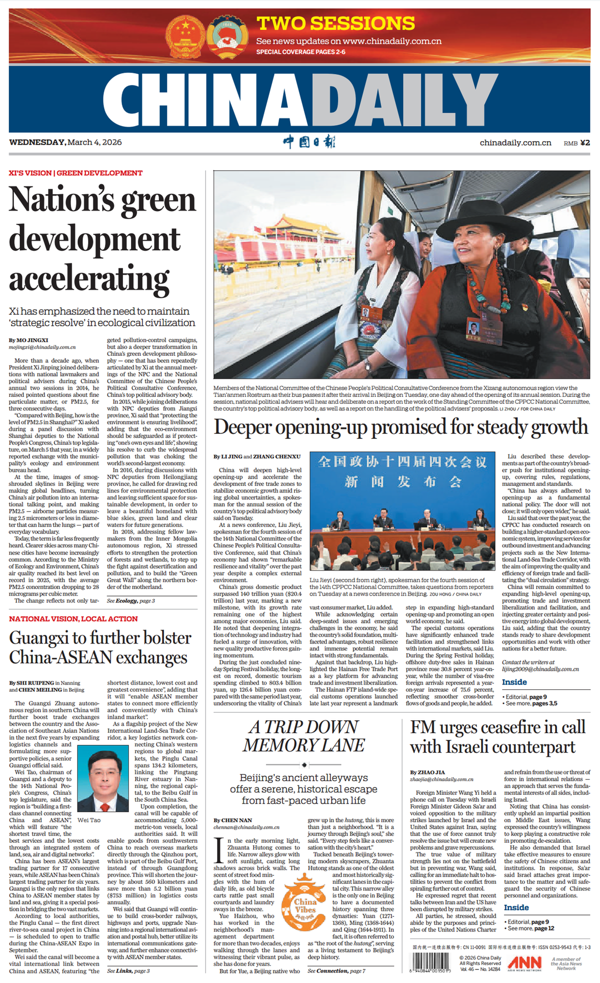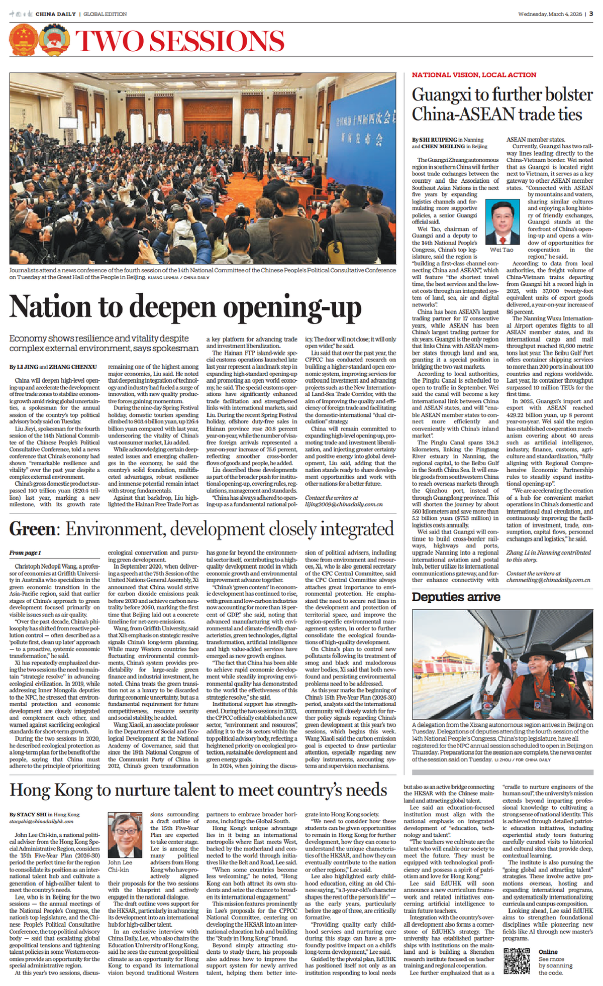 新闻眼2026年全国两会期间,《中国日报》推出“中国式现代化的地方实践” (National Vision, Local Action)高端访谈栏目,讲述中国式现代化建设道路上的地方特色实践。广西沿海、沿边、沿江,是我国唯一与东盟陆海相连的省区,连接着中国与东盟两个广阔市场。随着我国构建新发展格局深入推进、中国—东盟自贸区3.0版加快建设,广西独特区位优势将更加凸显。“十五五”时期,广西将如何依托自身优势抢抓机遇、努力在深化中国—东盟各领域合作全面发展中发挥更大作用?中国日报社记者就此专访了全国人大代表、广西壮族自治区主席韦韬。今日,《中国日报》头版刊发专访文章《充分发挥面向东盟开放合作的前沿和窗口作用 更好服从服务于构建中国—东盟命运共同体》(Guangxi to further bolster China-ASEAN exchanges)。