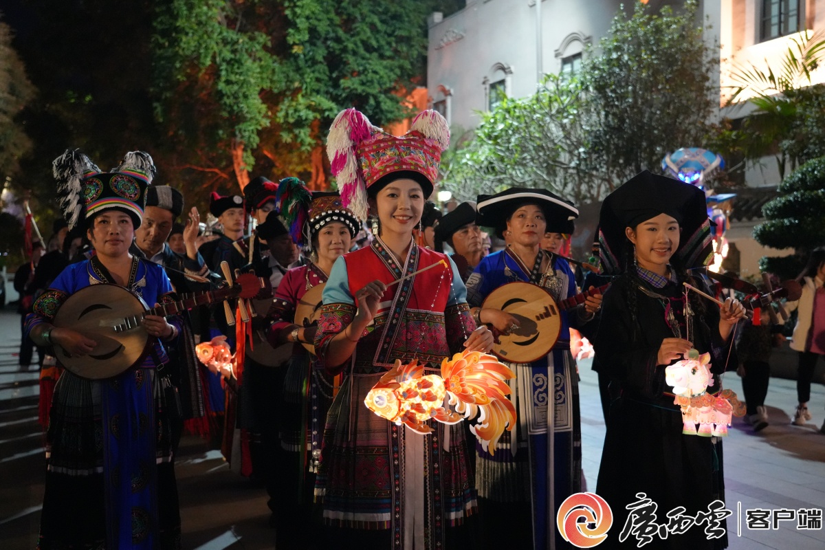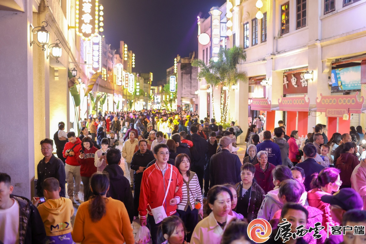 解放街夜景。通讯员 梁力升 摄 “开年第一热闹,必须带家人来!”市民刘女士一手牵着孩子,一手举着刚买的花灯,笑盈盈地说。在她周围,田阳壮族舞狮队腾挪跳跃,那坡壮族民歌婉转悠扬,隆林五彩民族服饰秀绚丽登场,引得围观人群阵阵喝彩。