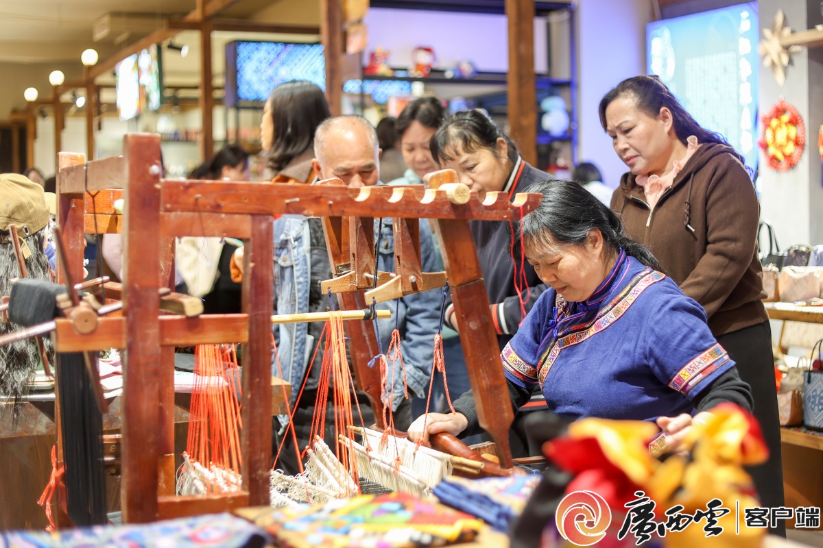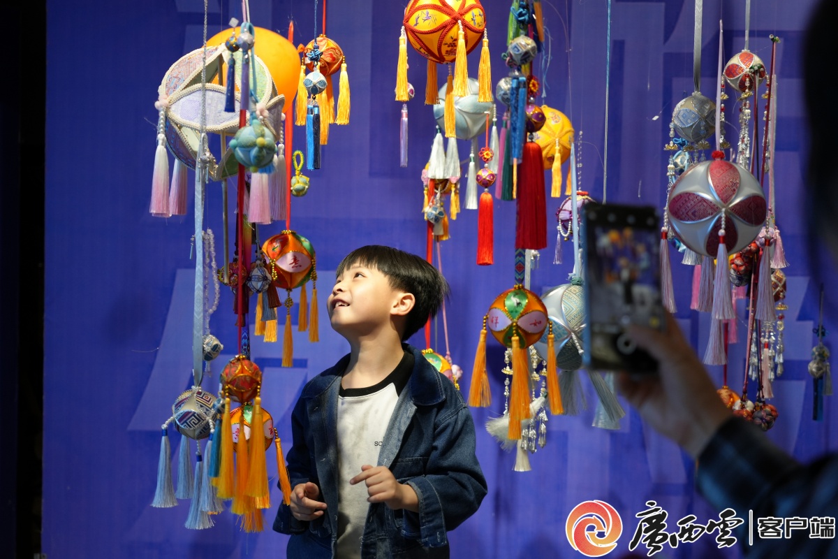 游客们在非遗大院参观非遗手作。通讯员 梁力升 摄 市民、游客在观赏绣球。记者 陆旺 通讯员 黄丹丹 摄 在解放街20号非遗大院,非遗DIY体验区排起小长队。来自广东的游客张女士正专注地制作壮锦发夹:“第一次亲手做非遗手作,很有成就感。百色的元宵节太有味道了!”她告诉记者,一家人专程来百色过年,没想到赶上了这么热闹的非遗大集。
