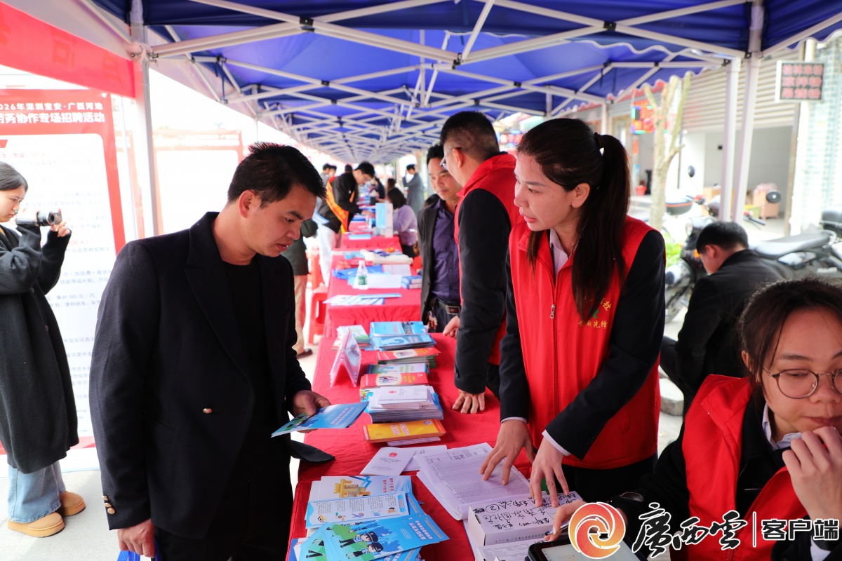 工作人员讲解相关政策。阳新英 摄 2月28日,深圳宝安·河池环江2026年春风行动暨就业援助季粤桂劳务协作专场招聘会在环江毛南族自治县毛南家园社区举行,将5000余个优质岗位直接送到群众“家门口”。 本次活动由深圳市宝安区与环江毛南族自治县人民政府联合主办,旨在精准搭建企业与求职者的对接桥梁。现场汇聚了来自粤桂两地的63家优质企业,涵盖电子信息、装备制造、新能源、家政服务等多个领域,共提供264个就业岗位,计划招聘5045人。岗位设置兼顾了高校毕业生、返乡务工人员、易地搬迁群众及就业困难人员等不同群体的需求。 企业工作人员讲解企业相关情况。阳新英 摄 招聘会现场气氛热烈,求职者们认真咨询岗位详情,企业代表耐心解答薪资待遇与发展前景。据统计,活动当天初步达成就业意向208人次。现场还设有直播带岗和政策咨询台,为求职者提供“一站式”就业指导服务。 同日,环江汽车总站启动了赴粤务工“点对点”免费输送活动,9辆爱心专车运送393名务工人员前往深圳、东莞等地返岗复工。