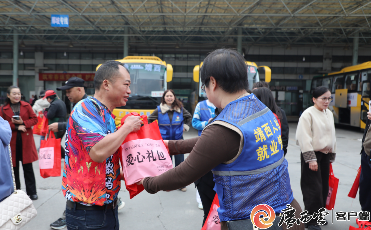 靖西市靖宇客运站“点对点”送工服务现场。通讯员 黄翔 蔡立 摄 3月5日上午,靖西市靖宇客运站内排满了办理“点对点”乘车手续的外出务工人员,大家携带行李,有序排队办理乘车手续,工作人员在现场发放爱心礼包,将温暖与关怀送到务工人员手中。 2026年春节期间,靖西市扎实开展外出务工人员“点对点”送工服务,精准对接重点园区企业用工需求,以实际行动为外出务工人员铺就返岗之路。