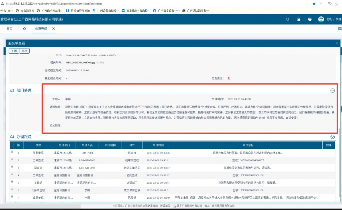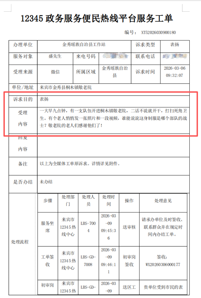 “一大早九点钟,有一支队伍开进桐木镇敬老院,二话不说就开干,想问问是哪个部队的战士。”3月9日,来宾市金秀瑶族自治县消防救援大队收到了一份特殊的感谢信——75岁的盛先生通过广西12345政务服务便民热线,提交了一份表扬工单,为这群默默奉献的“蓝马甲”小伙子点赞。 3月6日,盛先生向12345政务服务便民热线平台提交表扬工单。本文图片均为消防供图 3月6日早晨,桐木镇敬老院老人盛先生起床后,听到窗外有些动静,他循声望去,看到楼下一群身着“蓝马甲”的小伙子正在忙碌着,清水沟、拔杂草,清扫楼栋后方区域。盛先生说,这片地方多年未清理,蚊虫滋生,气味难闻,小伙子们二话不说,挽起袖子就开始打扫,“整个上午,他们都在埋头干活,直到中午我们吃午饭时,他们才离开”。