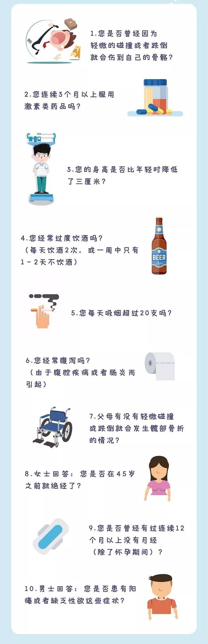 以下问题可以帮助进行骨质疏松高危情况的自我检测,任何一项回答为“是”者,则为高危人群,应当到骨质疏松症专科门诊进行就诊,早诊断早预防,早治疗。