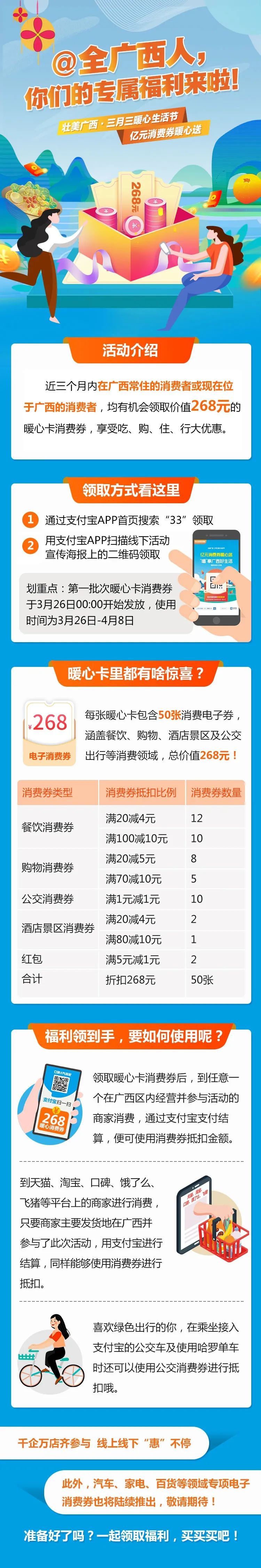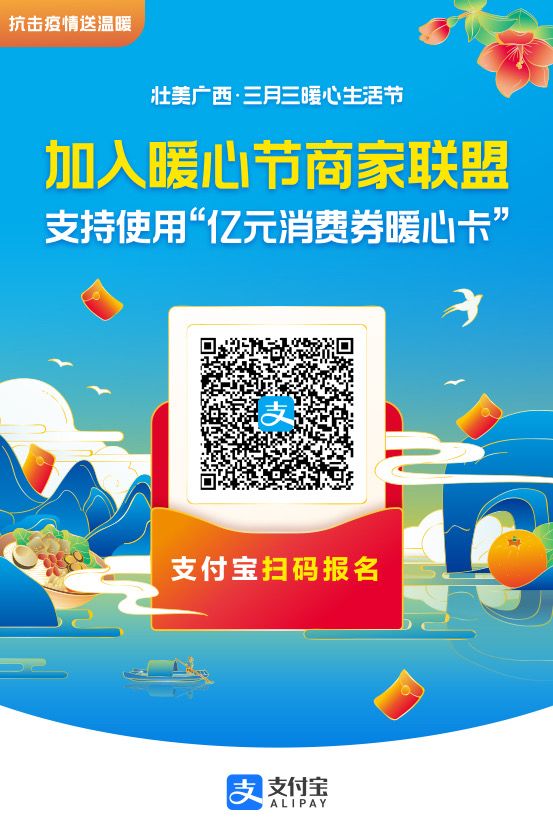 来啦来啦~ 2020“壮族三月三”就要来啦! 今年你打算怎么过节? 近年来, 随着节日期间商家们纷纷搞起的促销活动, “买买买”也正逐渐成为过节新风尚。 为落实自治区党委、政府统筹推进疫情防控和经济社会发展的决策部署,释放被疫情抑制、冻结的消费,推动消费市场快速回暖。自治区政府决定于3月26日至5月26日举办“壮美广西·三月三暖心生活节”,通过与阿里巴巴联手,推出“暖心、暖市、暖生活”系列活动,鼓励“云消费”,通过线上引流,带动全区线下零售、住宿、餐饮以及旅游等商贸服务业全面回暖。 重点来了! 此次活动, 广西通过支付宝投放亿元消费券, 普惠广西消费者及商家。 暖心卡消费券如何领取? 如何使用? 来来来,小编给您整理好了攻略↓↓↓