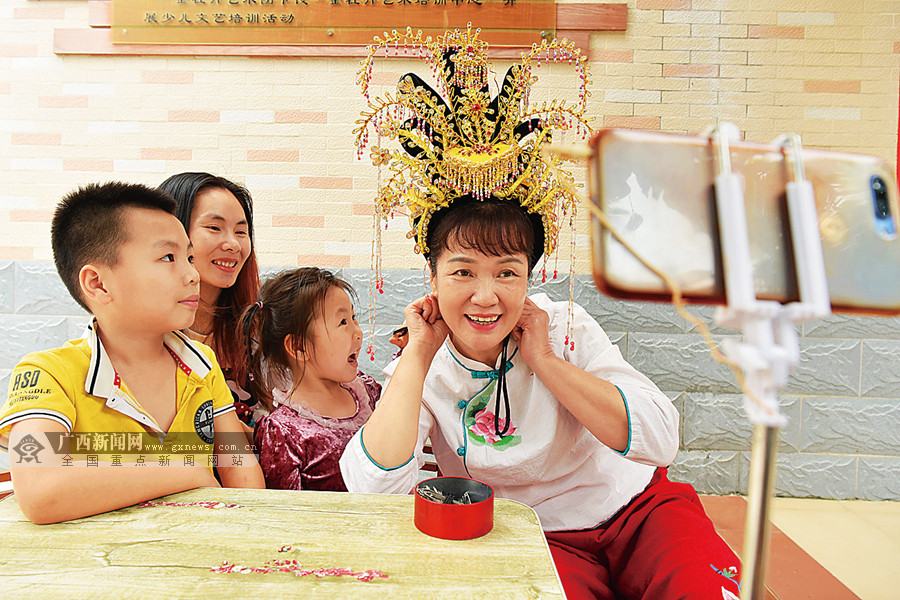 “三月三”期间,在合浦县一家艺术培训中心,自治区级非物质文化遗产代表性项目合浦公馆木鱼传承人廖烈莲,通过网络平台向学生们教授戏曲表演基本功。林启波 摄