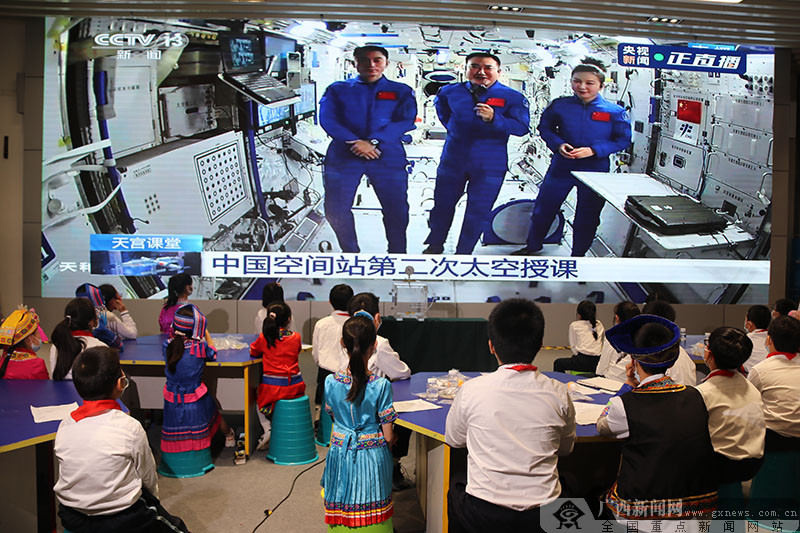 同学们跟随航天员进行科普实验。 “天宫课堂”是中国首个太空科普教育品牌,本次太空授课活动为“天宫课堂”第二课,仍然由神舟十三号乘组航天员翟志刚、王亚平、叶光富相互配合进行授课,继续采取天地对话方式进行,全国各地多家实体科技馆、流动科技馆、科普大篷车、农村科技馆组织青少年学习天宫课堂并参与地面连线互动。本次太空授课项目,主要包括太空“冰雪”实验、液桥演示实验、水油分离实验、太空抛物实验、空间科学设施介绍与展示、天地互动交流等特色太空课程。通过天地连线,参与由航天员在轨带领广大青少年在地面同步开展相关实验,使青少年从天地差异中感知宇宙的奥秘、体验探索的乐趣。 “天宫课堂”第二课开讲前,广西科技馆以《真空箱里的气球》科学实验拉开当天地面活动的帷幕;通过观看《盘点!2021年中国航天的那些高光时刻!》视频,回顾中国航天事业的高光时刻。科技辅导员还结合广西科技馆自主设计的“逐梦九天·仰望星空”航天与天文主题科普展,为同学们进行了《天眼》《昼夜与四季》等多项展品的互动讲解,带领同学们深入了解中国天文科技发展。 在“天宫课堂”第二课直播现场,现场的同学们利用中国科技馆配备的实验器材,跟随航天员们完成了一个个生动有趣的科普实验。
