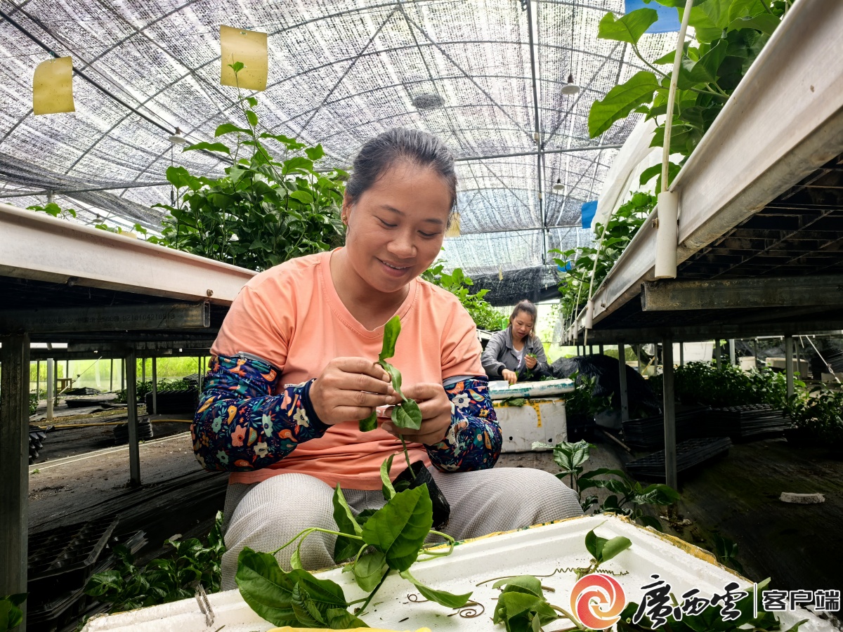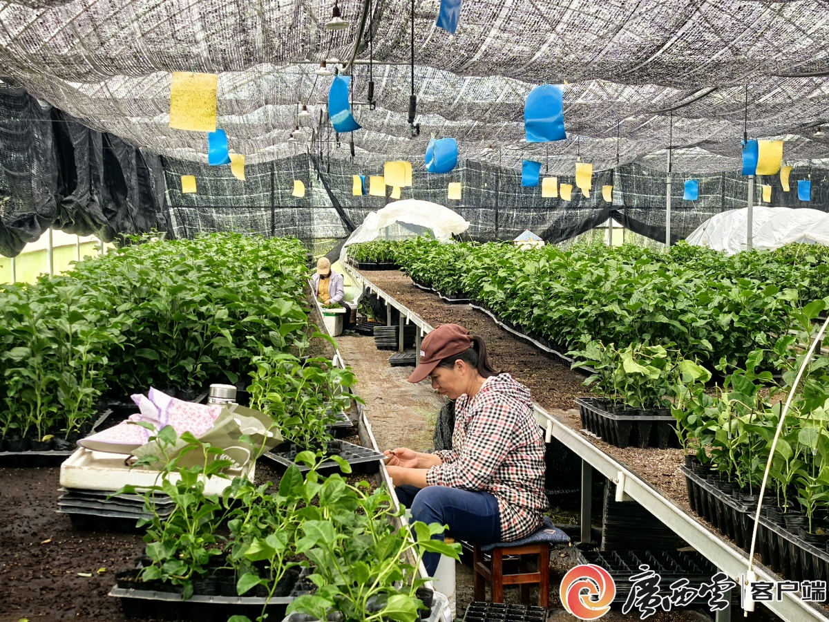 工人忙嫁接果苗。何秋艳 摄 近年来,地州镇通过建立“企业+村集体+农户”利益共享机制,引进广西钦赐农业科技有限公司、广西靖乡农旅有限公司,联合发展百香果产业,年培育“钦果9号”黄金百香果苗达300万株,并通过电商平台和农业展销会等拓宽销路,推动“线上+线下”双渠道销售,所产的百香果苗远销广东、海南、云南等地,产值700万元以上,每年可为村集体经济增收20万元左右,为周边村民提供就业岗位50多个。 |