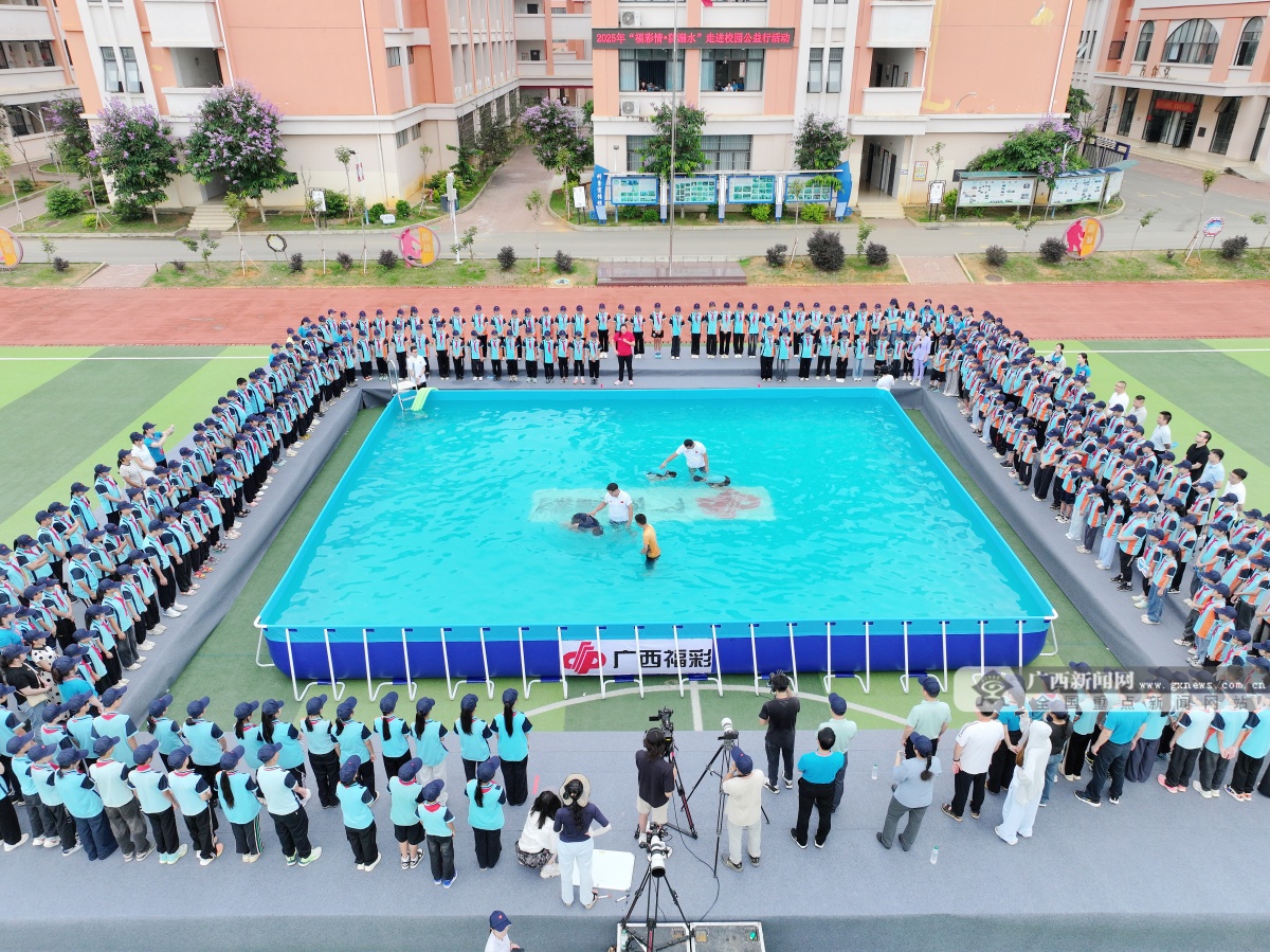 近日,由广西壮族自治区民政厅、教育厅指导,广西福利彩票发行中心(以下简称广西福彩中心)主办的2025年“福彩情·防溺水”走进校园公益行活动第二站,在崇左市龙州县龙州镇城南新区小学举行。活动聚焦夏季溺水事故高发风险,通过专业演练、物资捐赠及科普教育,为学生送上了一堂至关重要的防溺水必修课。300余名师生及家长代表现场参与活动,数千名该校学生通过教室直播同步学习。广西福彩中心还向学校捐赠了一批防溺水爱心物资,全力支持校园安全教育。