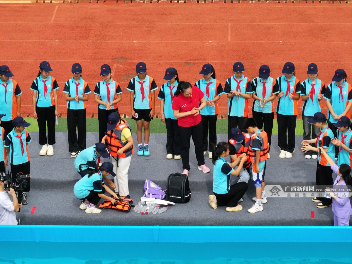 活动现场。 龙州水网密布,夏季溺水风险不容忽视,城南新区小学负责人深有感触:“青少年安全牵动着千家万户的心。龙州地理位置特殊,水域丰富,防溺水教育尤为重要。广西福彩中心走进我们校园,通过形式新颖、内容充实的专业讲解和高度还原的模拟演练,给孩子们留下了极其深刻的印象。孩子们不仅学到了防溺水的安全知识要点,更重要的是掌握了宝贵的自救互救技能,为他们的生命安全增添了一道坚实的屏障。” 广西福彩中心向城南新区小学捐赠一批防溺水爱心物资。 活动设置了核心防溺水安全演练环节,特邀世界游泳冠军杨丽娜及其专业教练团队进行实战教学。在演练现场,杨丽娜团队向师生和家长代表们重点讲解了识别溺水风险关键的“黄金15秒”,详细剖析了溺水的早期征兆,特别强调了施救的及时性与科学性。团队教练还示范了“水母漂”“仰卧漂浮”等基础有效的自救技巧,并创新性地展示了如何利用身边常见的物品(如空水瓶)进行应急自救。通过邀请学生和家长上台亲身体验、互动参与,这些实用性强、操作性高的防溺水安全知识和技能得到有效传递。