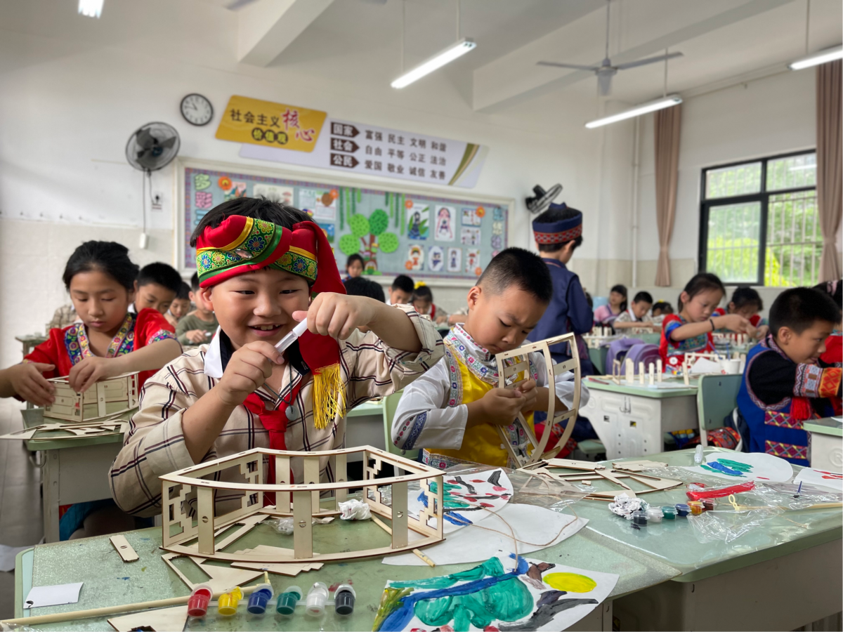 同学们兴致勃勃地制作绣球等传统手工艺品。