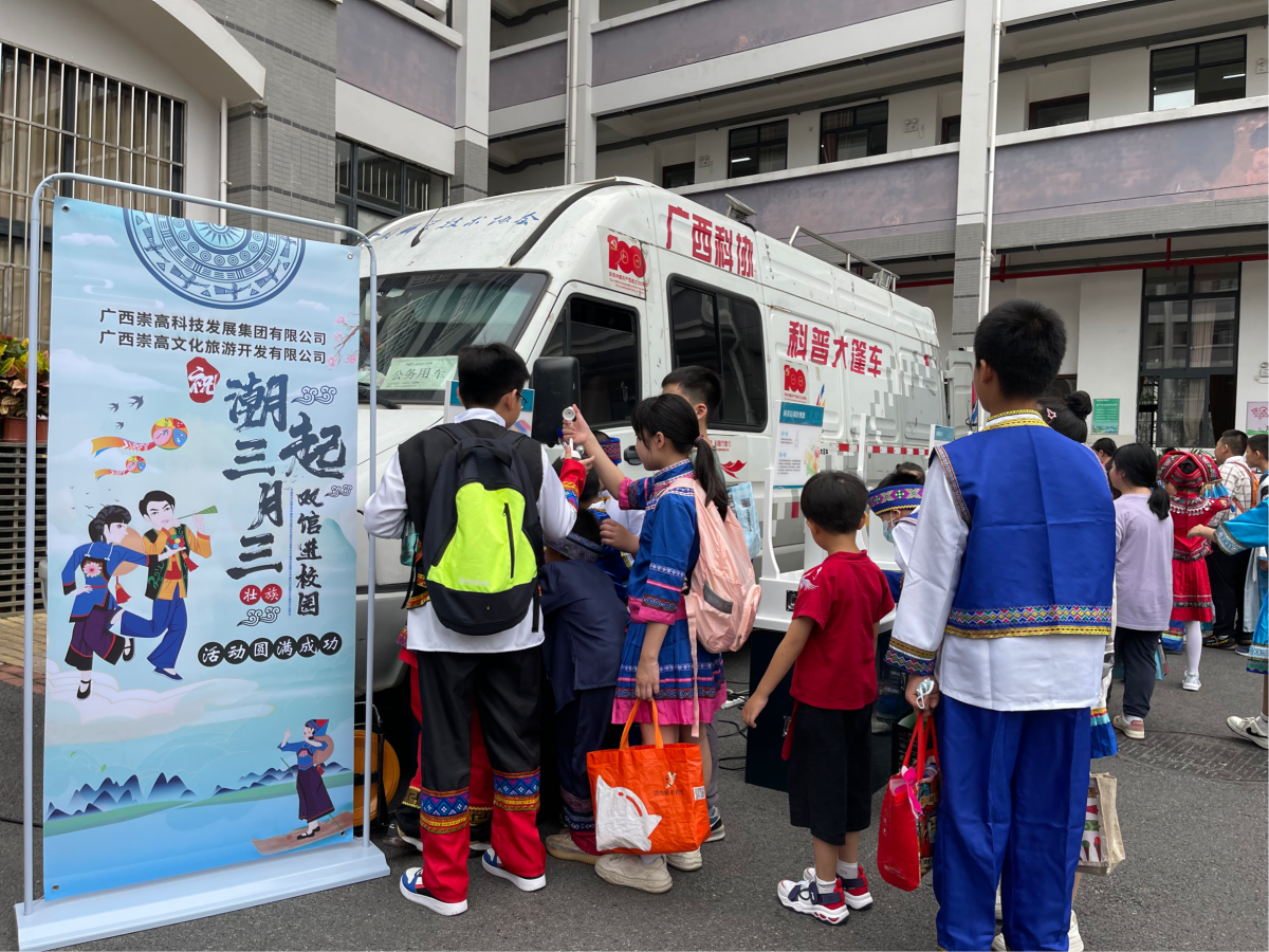 传统绣球手工制作教学、铜凤灯等文物图片展示、吸睛的流动3D影院、展示光学、电磁现象、运动与力的大篷车展区……4月20日,由广西壮族自治区博物馆、广西壮族自治区科学技术馆主办的“潮起三月三·双馆进校园”活动走进南宁市凤翔路小学景晖校区,独具特色的博物馆、科技馆“双馆齐下”校园系列文化活动,得到了凤翔路小学两校区4000多名师生的热烈欢迎和积极参与。