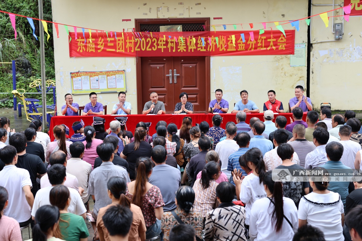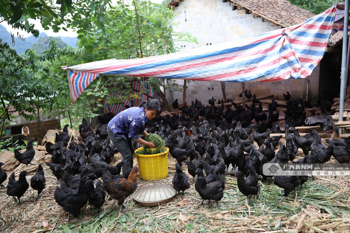 三团村集体经济收益分红大会现场。 寸土“生金”谋划增收“方寸园” 在三个标准化养殖场里,苍翠山林下,数千只五黑鸡体格健壮、毛色鲜艳,农户提着半桶玉米粒正给鸡喂食。“我们主要采用纯天然的传统饲养方式养殖五黑鸡,喂食玉米,并以散养的形式让五黑鸡觅食丛林下的昆虫、蠕虫等天然食物,这种土鸡蛋白质含量高,对身体大有益处。”第一书记苏克辉介绍,合作的公司经常来开展指导,村民们也纷纷参与到这个项目。 基于独特的地理气候环境优势,三团村因户施策发展庭院经济,在盘活闲置资源的同时进一步拓宽农民增收渠道,让方寸之地变成增收宝地。在广投桥巩能源公司帮助下,向村民发放了1800只五黑鸡苗,并组织干部群众、致富能人等一起交流学习,以“公司+村合作社+农户”的发展模式发展五黑鸡养殖。坚持生态放养先进理念,显著提升了五黑鸡的品质,代养户依托专业技术,实现养殖效益的稳步增长,有效推动产业发展“增量”。 在统一协调和运作下,如今,五黑鸡庭院经济悄然在山间“生根发芽”。庭院经济投资少、见效快,且商品率高、经营灵活、适应市场变化,既充分利用了闲置场地,又推动了产业的发展壮大。可充分利用农村剩余劳动力和劳动时间,又能帮助村民实现在家门口创业就业。农户充分利用自家的庭院发展种植养殖产业,让庭院发挥出最大的价值,让群众又多了一处增收渠道。2024年通过消费帮扶、电商等渠道采购三团村农产品33万余元,其中帮助销售五黑鸡7000余只。2024年10月,三团村举行五黑鸡代养分红仪式,发放的收益金总额高达14.4万元,惠及38户脱贫户家庭。让“寸土”生“寸金”。在三团村,小庭院正在成为家家户户幸福生活的“后花园”,方寸之地不断展现着促进农户增收的价值潜力。