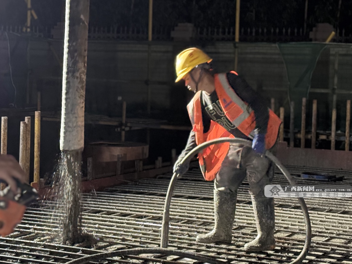 浇筑混凝土过程现场施工管理人员邓李亿正在进行监督管控