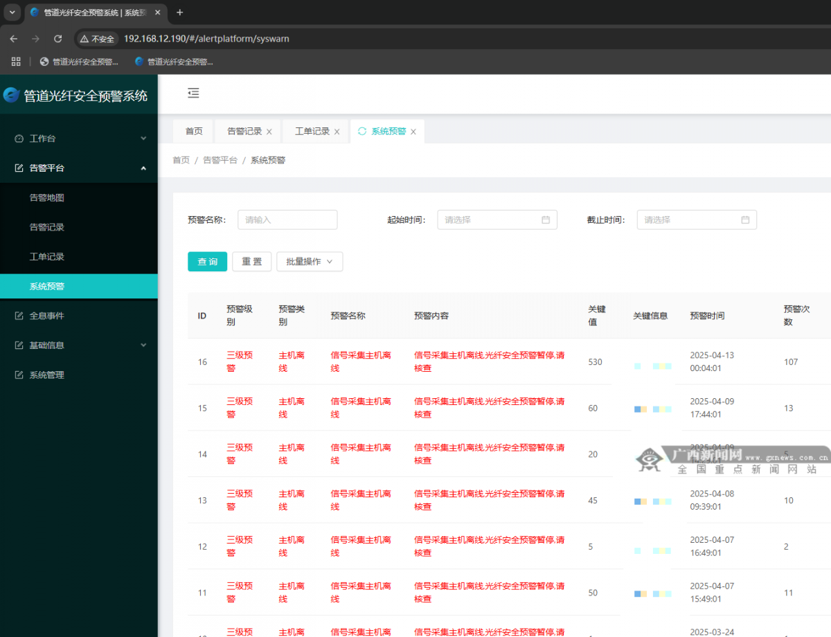 管道光纤安全预警系统。 春风浩荡战鼓急,壮志雄心启新程。广投管网公司在春日的蓬勃朝气中,奏响了发展的激昂乐章,为全年发展铺就坚实基石。下一步,公司将紧紧把握时代脉搏,持续秉持创新驱动、服务至上的发展理念,以时不我待的紧迫感和使命感,为用户提供更加稳定、高效的天然气供应保障,切实满足自治区日益增长的能源需求,以实际行动助力自治区“一区两地一园一通道”建设,在天然气领域续写更为辉煌灿烂的崭新篇章。 |