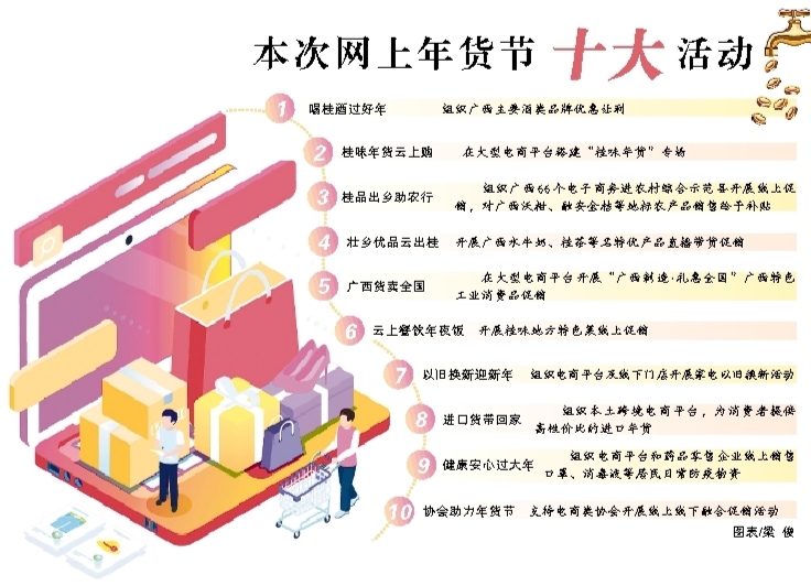 据悉,此次活动在大型电商平台开设广西专场,联动区市县三级农业、制造业、商贸流通和生活服务等行业企业,实施“十百千万”线上线下融合年货促销行动,聚焦桂酒产品、桂味年货、生活必需品、特色农产品、特色食品、工业消费品、餐饮、家用电器、进口商品、防疫商品等10个重点年货品类,举办100场以上主题活动,发动1000家以上企业参与,销售上万种商品,丰富年货商品和服务,充分挖掘春节市场消费潜力,营造浓厚的年货促销氛围。