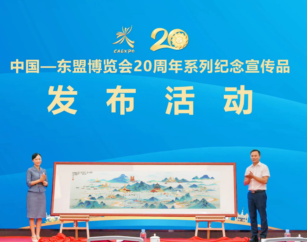 今年是东博会创办20周年,为营造隆重、热烈、喜庆的宣传氛围,东博会秘书处全面开展系列主题宣传活动,精心策划设计系列纪念宣传品。本次活动发布东博会20周年主题纪念画《家园如画》,以及东博会20周年纪念邮资信封、纪念邮折和纪念章。
