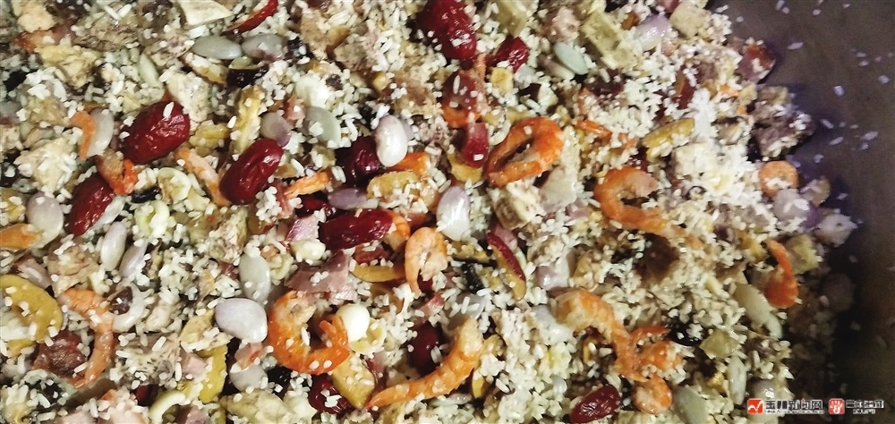 “这道菜制作颇为繁杂,所以很耗时间。”曾基介绍,制作时首先将荔浦芋去皮洗净切丁,然后入油锅炸酥,再将虾米、薏米、香菇等泡发好洗净,接着将瘦肉和香菇切丁。然后便是爆炒姜、葱、蒜,待炒出香味后,即放入肉丁加料酒同炒,再加盐、白糖、蚝油、生抽、味精等,将配料炒制成八宝料。