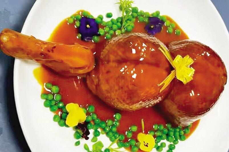 这时,爆香一份姜片、葱,配上料酒,将沥干余油的鸭子放入锅中,加入清水(把原料浸没为宜),再放进蚝油、生抽、腐乳、白糖等调好味,加入八角、陈皮和香叶,用中小火煲1.5小时至酥烂,之后取出放入盘中,用湿生粉勾厚芡淋在鸭身上,再用焯过水的青菜之类食材铺在周边,一盘色香味俱佳的八宝鸭就大功告成了。“煮熟端上餐桌,香味四处飘溢,满堂皆香。”曾基说。