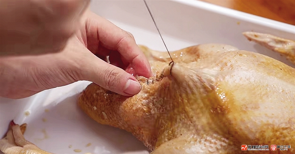 把配料装好后,要把鸭肚缝好,以保证“香不外泄”。